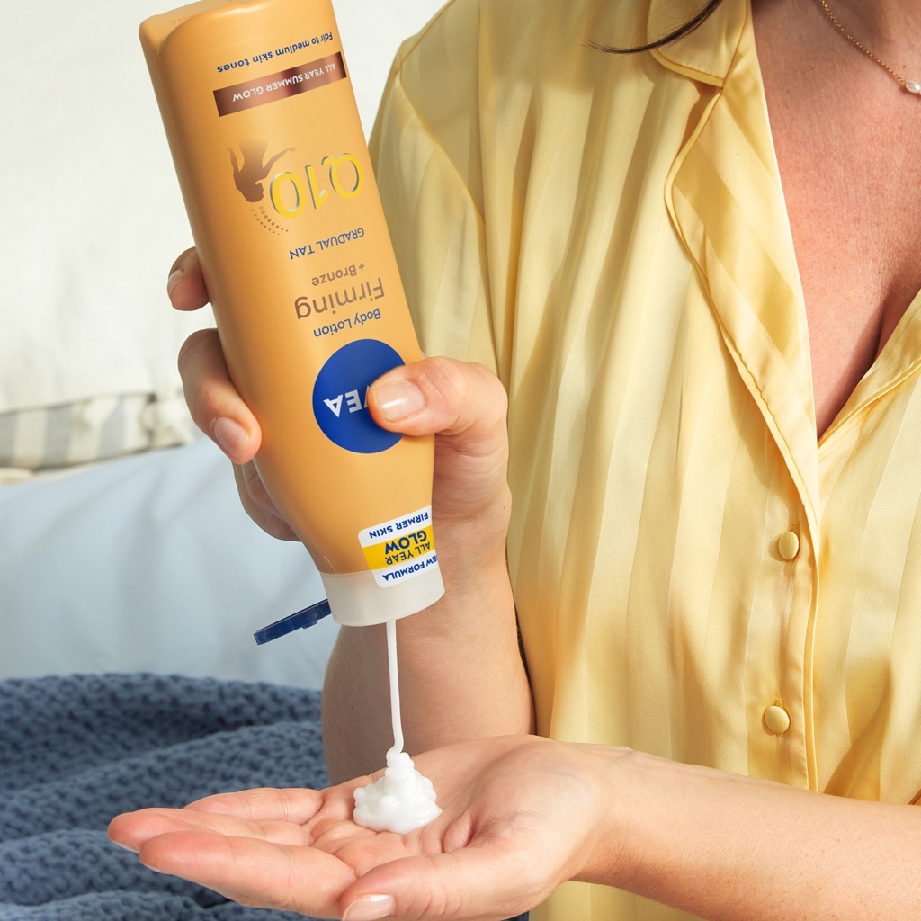 Η διατήρηση ενός ομοιόμορφου τεχνητού μαυρίσματος μπορεί να είναι απαιτητική· μια ενυδατική λοσιόν σταδιακού μαυρίσματος ίσως είναι η λύση για φυσικό, χωρίς γραμμές αποτέλεσμα. Χρησιμοποιήστε τη NIVEA Gradual Tan Λοσιόν για να συνδυάσετε σταδιακό μαύρισμα με άμεση ενυδάτωση και αίσθηση σφριγηλότητας στην επιδερμίδα, με φυσική, λαμπερή «ηλιοκαμένη» όψη. Εμπλουτισμένη με το αντιγηραντικό συστατικό συνένζυμο Q10, η NIVEA Gradual Tan Λοσιόν προσφέρει αποτέλεσμα σύσφιξης και σφριγηλότητας. Η φόρμουλα περιέχει μικρές δόσεις σταδιακού αυτομαυριστικού, ώστε να μπορεί να χρησιμοποιείται καθημερινά για ομοιόμορφο, μπρονζέ τόνο όλο τον χρόνο. Έχει φρέσκο, καλοκαιρινό, ανθώδες άρωμα με νότες τριαντάφυλλου, γιασεμιού, ροδάκινου και δαμάσκηνου και δεν αφήνει τη χαρακτηριστική μυρωδιά που έχουν συχνά άλλα αυτομαυριστικά.