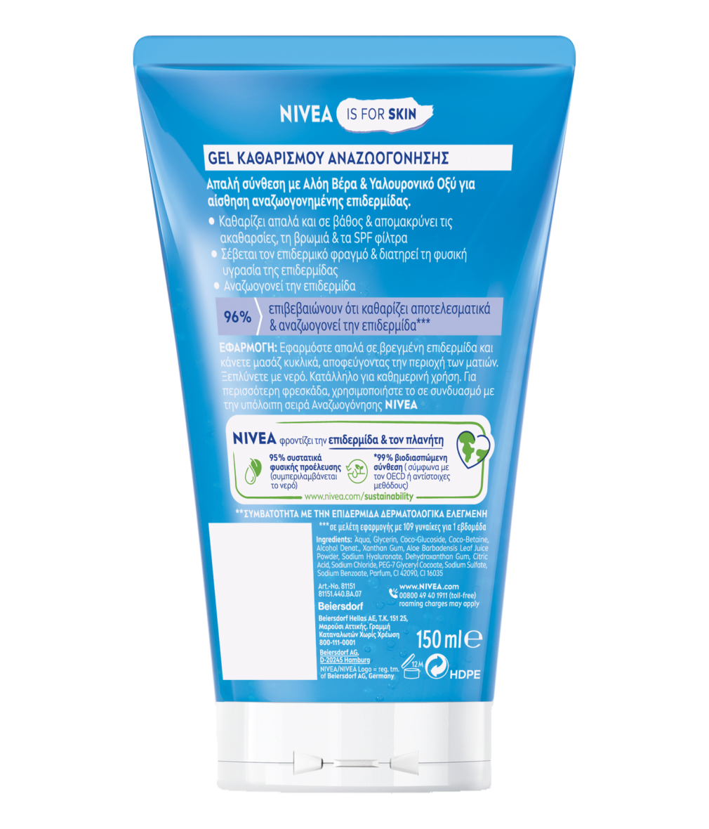 Το Δροσιστικό Gel Καθαρισμού Προσώπου της NIVEA είναι εμπλουτισμένο με Αλόη Βέρα και Υαλουρονικό Οξύ, που είναι γνωστό ότι δεσμεύουν την υγρασία της επιδερμίδας. Ειδικά σχεδιασμένο για κανονική και μικτή επιδερμίδα, όχι μόνο καθαρίζει σε βάθος, απομακρύνοντας τους καθημερινούς ρύπους, αλλά και αναζωογονεί και ανανεώνει την επιδερμίδα. Επιπλέον, φροντίζει την επιδερμίδα και διατηρεί τη φυσική της υγρασία.