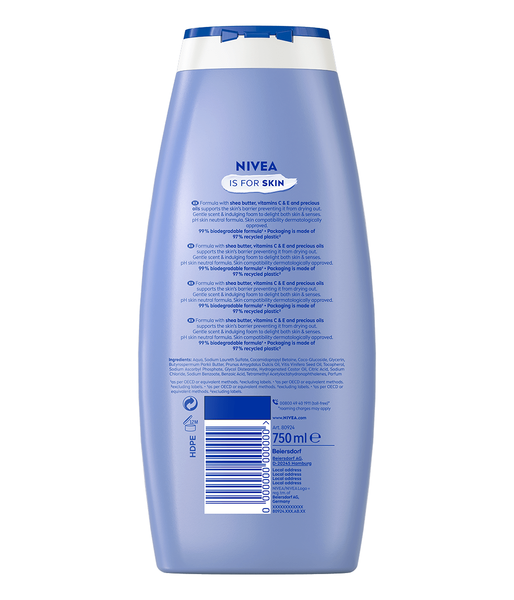 Το Κρεμώδες Αφρόλουτρο NIVEA Creme Smooth αφήνει απαλή και λεία αίσθηση στην επιδερμίδα. Με σύνθεση εμπλουτισμένη με Βιταμίνες C, E & Βούτυρο Καριτέ, θα αισθάνεστε την επιδερμίδα σας ελαστική και ενυδατωμένη όλη μέρα. Απολαύστε ένα πολυτελές αφρώδες μπάνιο και το απαλό άρωμα του Βούτυρου Καριτέ.