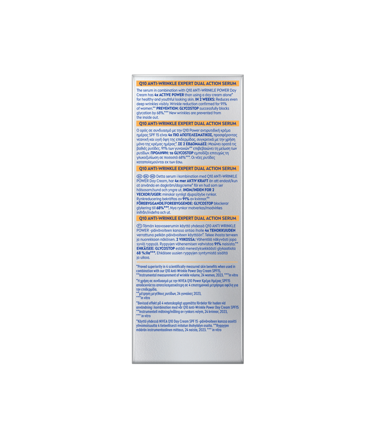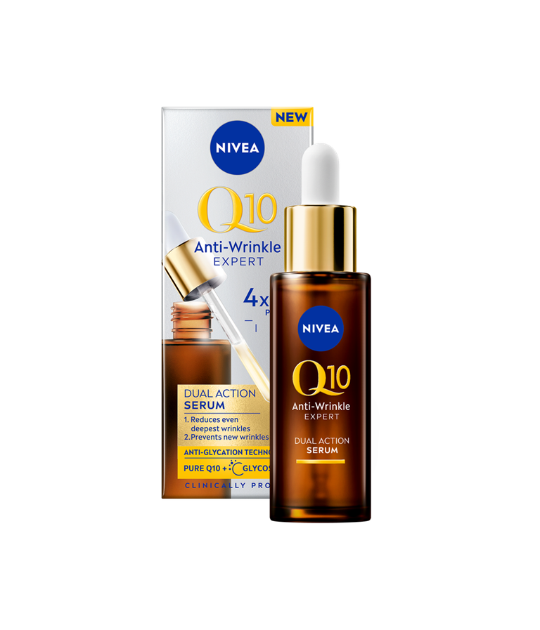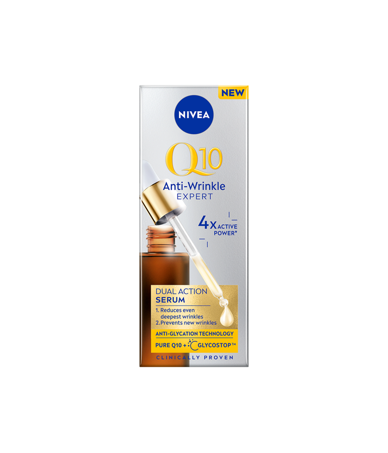 Q10 Anti-Wrinkle Expert Dual Action Serum με Anti-Glycation Τεχνολογία με καθαρό Q10 και GLYCOSTOP μειώνει ακόμα και τις πιο βαθιές ρυτίδες και αποτρέπει τη δημιουργία νέων ρυτίδων που προκαλούνται από τη γλυκοζυλίωση.