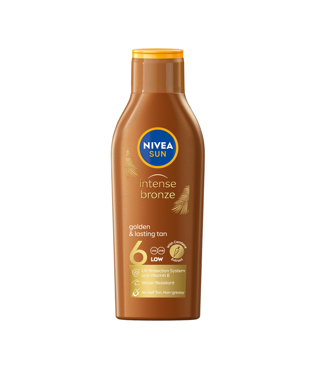 Αντιηλιακή προστασία για έντονο και όμορφο μαύρισμα με εκχύλισμα καροτίνης και χωρίς αυτομαυριστικές ιδιότητες. Σύνθεσή του σέβεται τη θάλασσα. NVEA SUN Intense Bronze Λοσιόν
