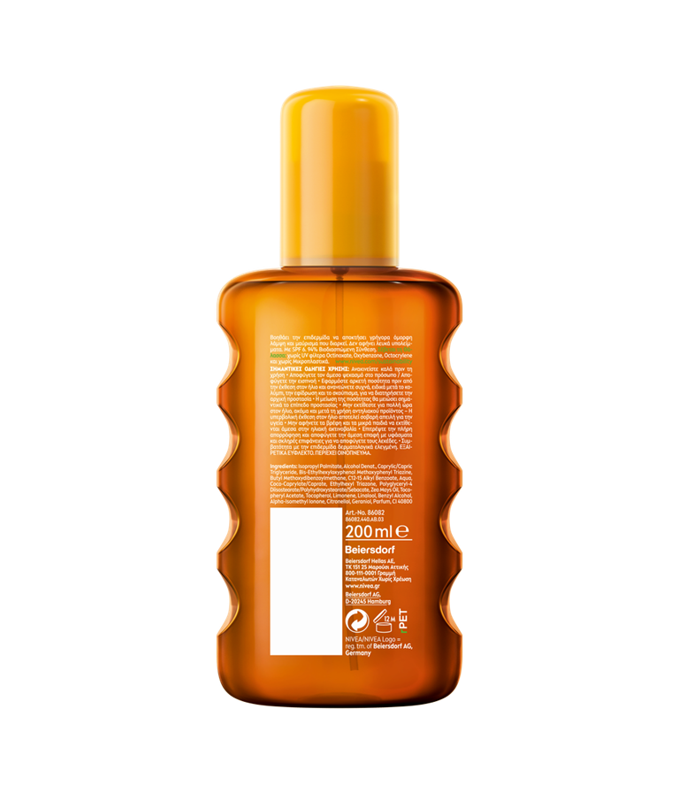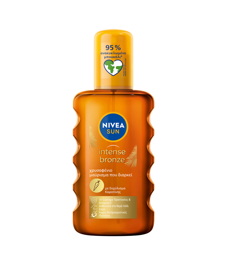Αντιηλιακή προστασία για έντονο και όμορφο μαύρισμα με εκχύλισμα καροτίνης και χωρίς αυτομαυριστικές ιδιότητες. Σύνθεσή του σέβεται τη θάλασσα. NVEA SUN Intense Bronze Oil Spray.