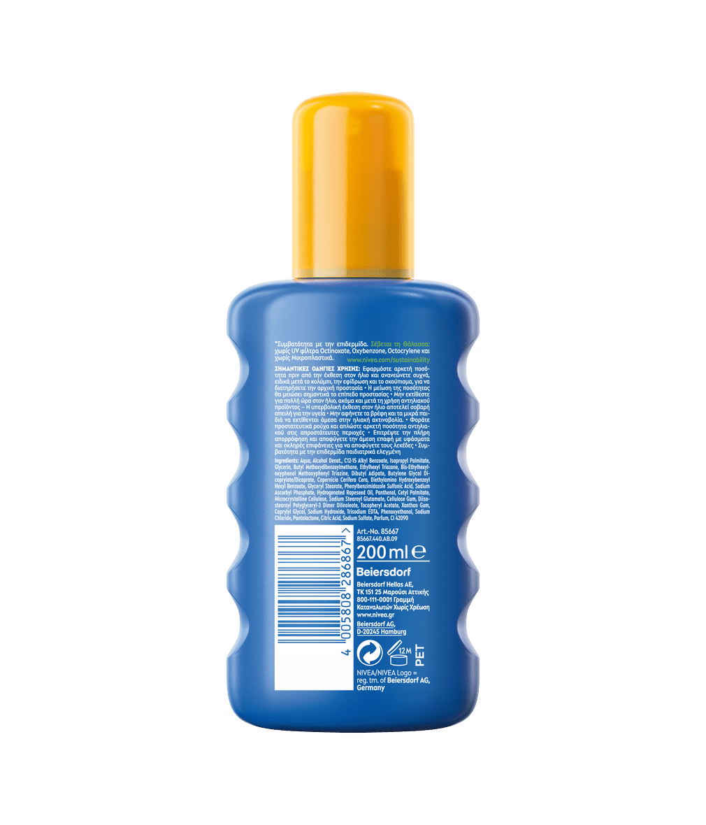 ΣΗΜΑΝΤΙΚΕΣ ΟΔΗΓΙΕΣ ΧΡΗΣΗΣ: Ανακινείστε καλά πριν τη χρήση • Αποφύγετε τον άμεσο ψεκασμό στο πρόσωπο/Αποφύγετε την εισπνοή • Εφαρμόστε αρκετή ποσότητα πριν από την έκθεση στον ήλιο και ανανεώνετε συχνά, ειδικά μετά το κολύμπι, την εφίδρωση και το σκούπισμα, για να διατηρήσετε την αρχική προστασία • Η μείωση της ποσότητας θα μειώσει σημαντικά το επίπεδο προστασίας • Μην εκτίθεστε για πολλή ώρα στον ήλιο, ακόμα και μετά τη χρήση αντηλιακού προϊόντος – Η υπερβολική έκθεση στον ήλιο αποτελεί σοβαρή απειλή για την υγεία • Μην αφήνετε τα βρέφη και τα μικρά παιδιά να εκτίθενται άμεσα στην ηλιακή ακτινοβολία • Φοράτε προστατευτικά ρούχα και απλώστε αρκετή ποσότητα αντηλιακού στις απροστάτευτες περιοχές • Επιτρέψτε την πλήρη απορρόφηση και αποφύγετε την άμεση επαφή με υφάσματα και σκληρές επιφάνειες για να αποφύγετε τους λεκέδες • Συμβατότητα με την επιδερμίδα παιδιατρικά ελεγμένη