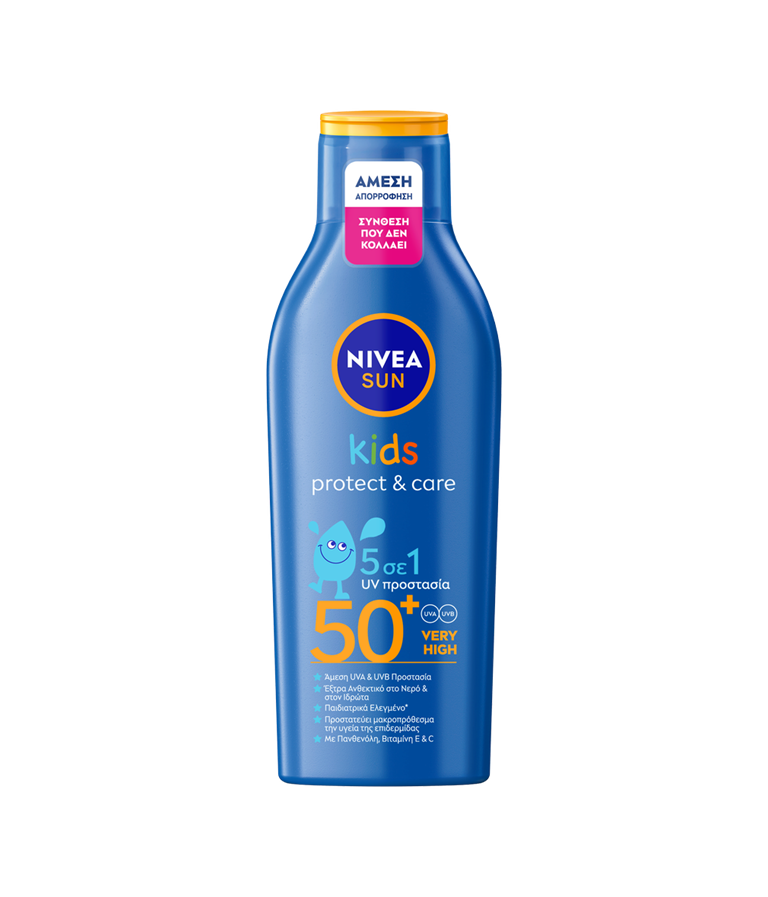 Αξιόπιστη 5σε1 αντηλιακή UV προστασία ειδικά σχεδιασμένη για τις ανάγκες της ευαίσθητης παιδικής επιδερμίδας. Άμεση UVA/UVB προστασία με σύνθεση έξτρα ανθεκτική στο νερό και στον ιδρώτα. NIVEA SUN Kids Protect & Care Lotion SPF50+.