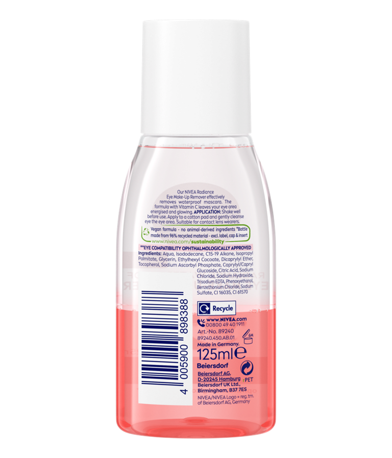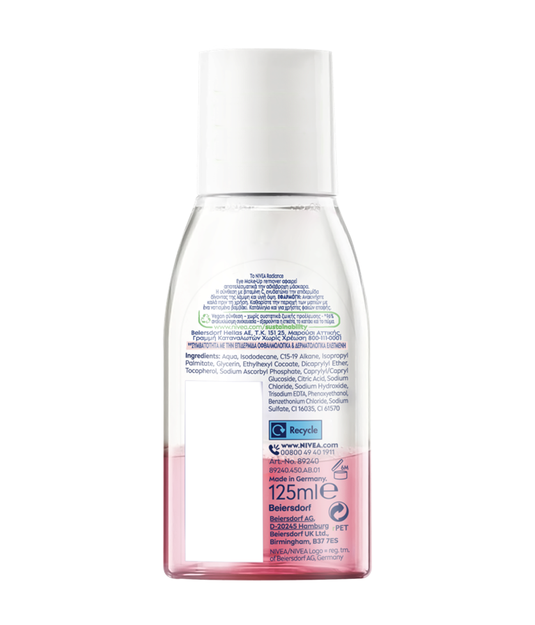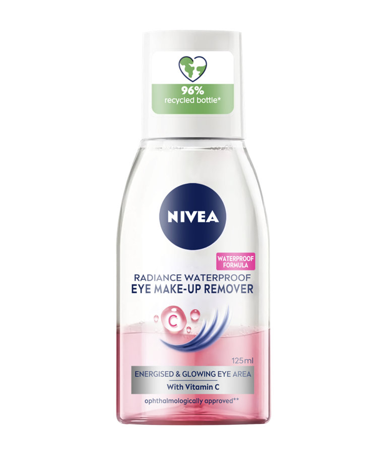 Αφαιρέστε αποτελεσματικά ακόμη και την εξαιρετικά αδιάβροχη μάσκαρα και το μακιγιάζ με το NIVEA Λοσιόν Radiance Waterproof Ντεμακιγιάζ Ματιών 2 φάσεων. Το προϊόν φροντίζει την ευαίσθητη περιοχή των ματιών σας | 125 ml