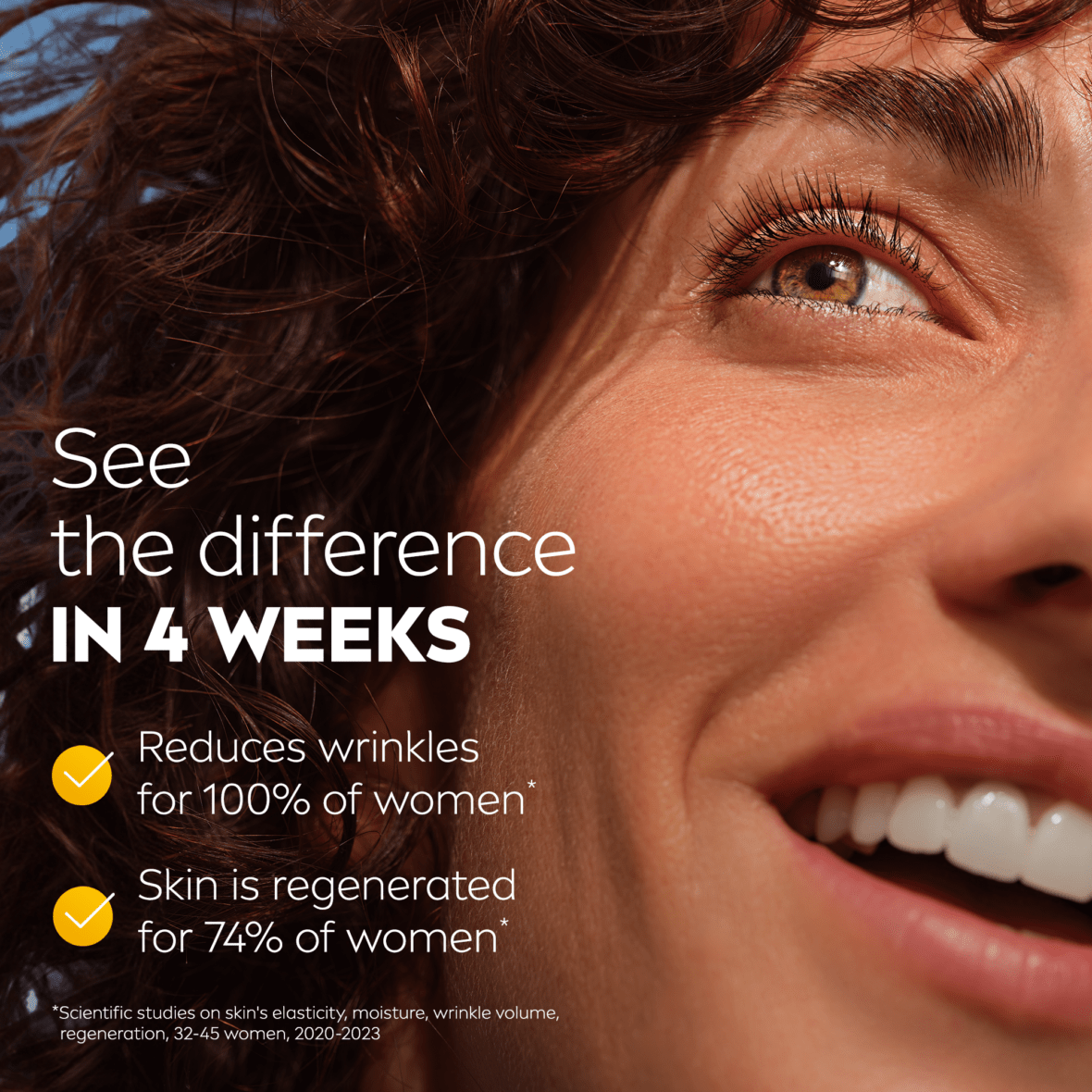 Με βάση 25 χρόνια έρευνας, οι επιστήμονες της NIVEA μελέτησαν περισσότερους από 60.000 χρήστες για να βελτιώσουν τα προϊόντα μας. Προϊόντα με πλούσια υφή που απλώνονται εύκολα στην επιδερμίδα, αλλά παράλληλα φροντίζουν και ενυδατώνουν εντατικά την επιδερμίδα σας για άμεση αίσθηση απαλότητας. Χάρη στο DUO COLLAGEN BOOSTER, το Q10 & την Κρεατίνη, μαζί με αναβαθμισμένο υαλουρονικό οξύ, η επιδερμίδα γίνεται πιο σφριγηλή σε 7 ημέρες, βαθιά ενυδατωμένη για το 94% των γυναικών σε 2 εβδομάδες. Από τις 4 εβδομάδες και μετά, οι ρυτίδες μειώνονται για το 100% των γυναικών και η επιδερμίδα αναγεννάται για το 74% των γυναικών.** Τα αποτελέσματα είναι ΚΛΙΝΙΚΑ ΕΛΕΓΜΕΝΑ! ** Επιστημονικές μελέτες για την ελαστικότητα, την υγρασία, τον όγκο των ρυτίδων, την αναγέννηση της επιδερμίδας, 32-45 γυναίκες, 2020-2023