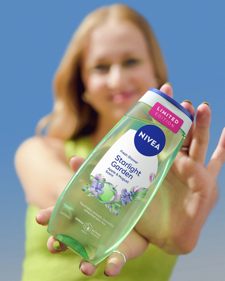 Ξεκινήστε ένα συναρπαστικό φουτουριστικό ταξίδι και βυθιστείτε σε μια λαμπερή σύνθεση αρωμάτων μήλου και κρίνου με το NIVEA Τζελ-Ντους Starlight Garden.