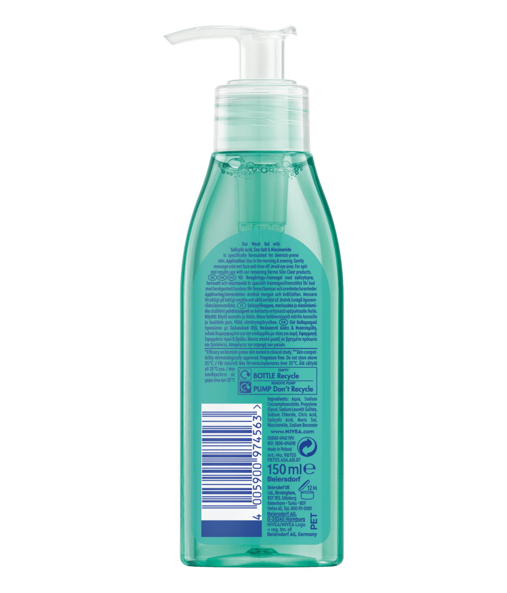 Θέλετε να αποκτήσετε ξανά τον έλεγχο της επιδερμίδα σας; Το NIVEA DERMA SKIN CLEAR Gel Κατά των πόρων είναι ειδικά σχεδιασμένο για την επιδερμίδα με τάση για ακμή. Εμπλουτισμένο με σαλικυλικό οξύ, θαλασσινό αλάτι και νιασιναμίδη, καθαρίζει σε βάθος, αφαιρώντας την υπερβολική λιπαρότητα και τις ατέλειες, χωρίς να ξηραίνει την επιδερμίδα. Για ορατά πιο καθαρή επιδερμίδα σε 7 ημέρες. Η συμβατότητα με την επιδερμίδα είναι δερματολογικά ελεγμένη και η αποτελεσματικότητα σε επιδερμίδα με τάση για ακμή είναι δοκιμασμένη σε κλινική μελέτη. Το Derma Skin Clear gel καθαρισμού χρησιμοποιείται ως πρώτο βήμα στην πρωινή και βραδινή ρουτίνα σας.