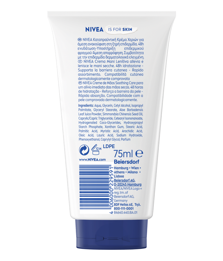 Η NIVEA Kαταπραϋντική Κρέμα Χεριών με Αλόη προσφέρει 48ωρη ενυδάτωση και άμεση απορρόφηση για απαλά βελούδινα χέρια. Ενισχύει τον επιδερμικό φραγμό.