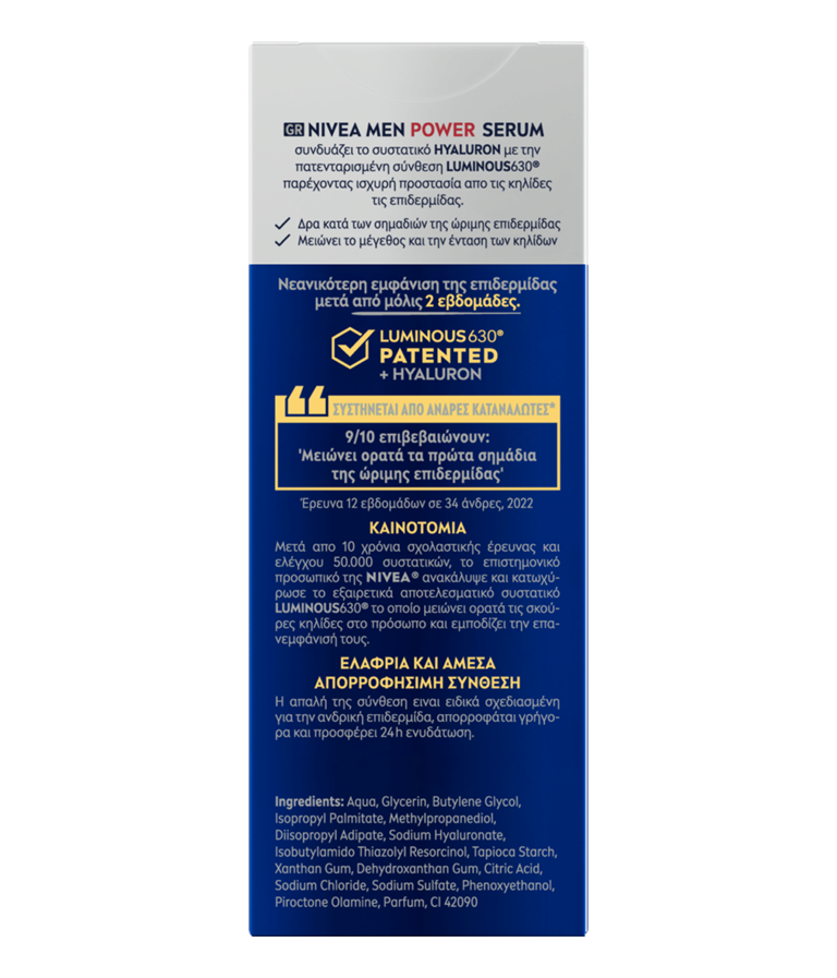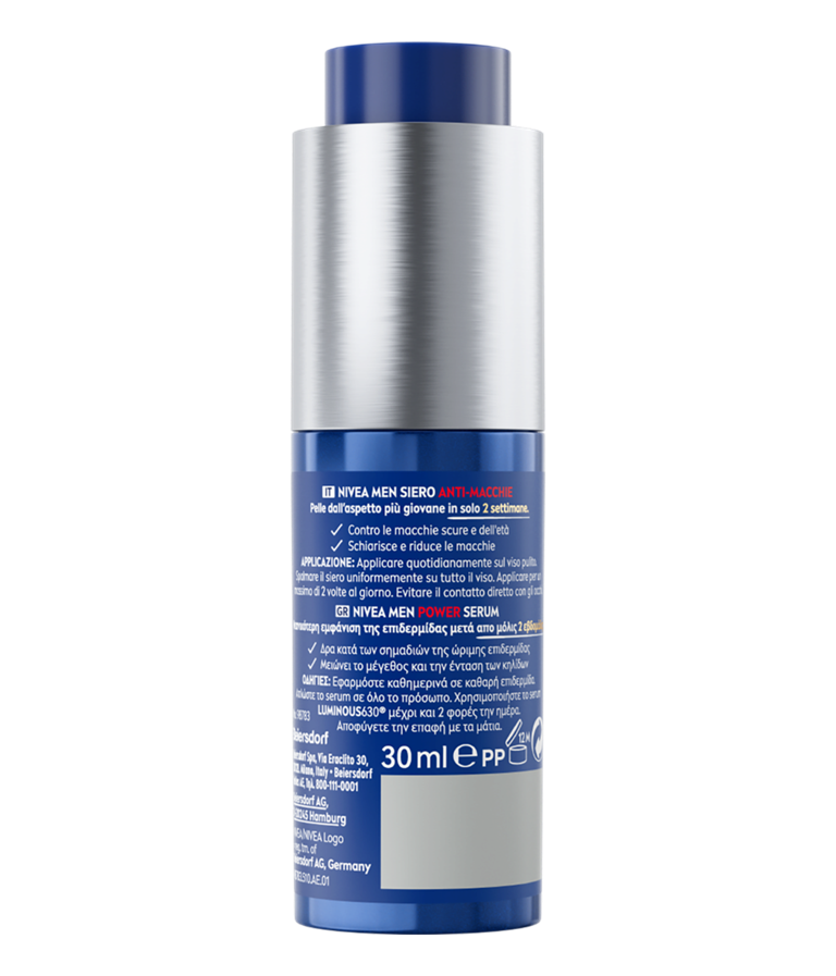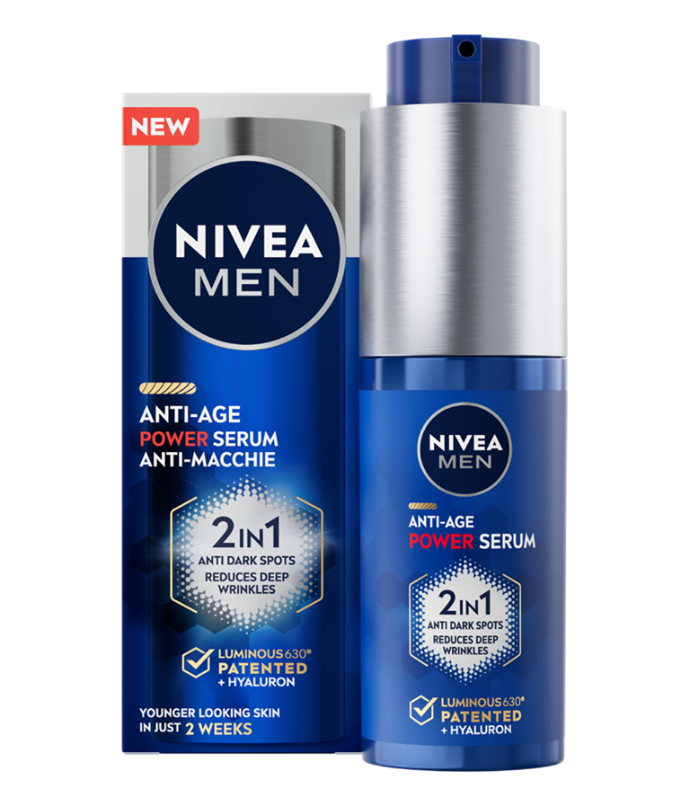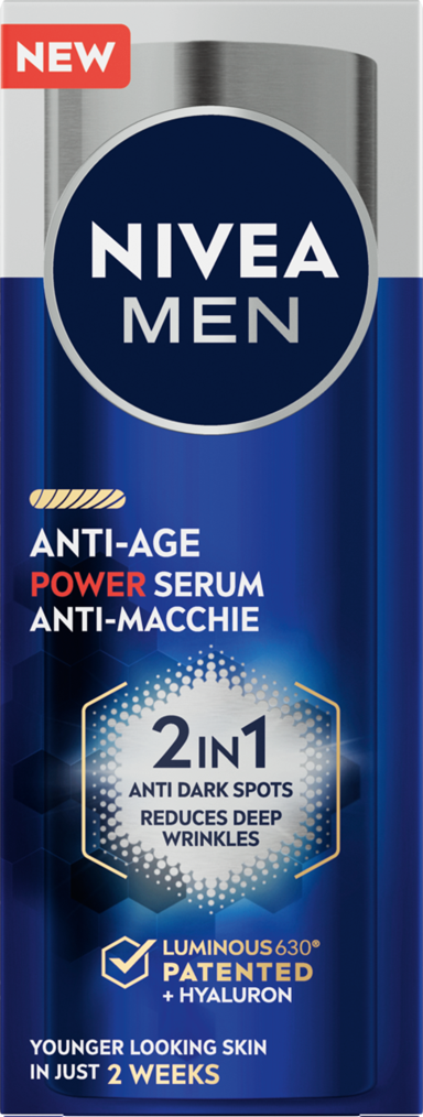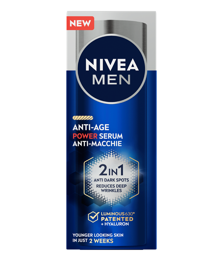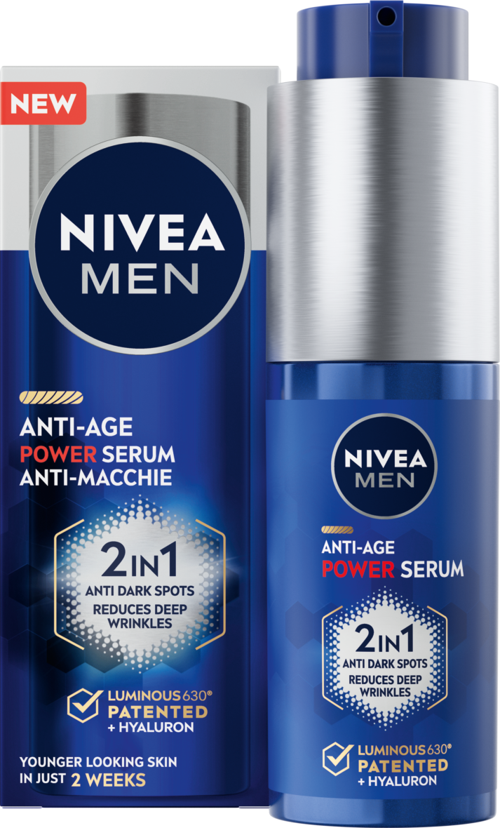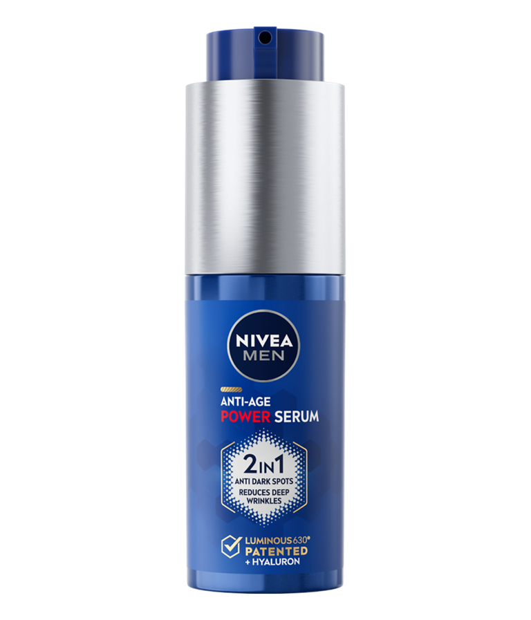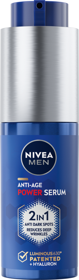 Το NIVEA MEN 2σε1 LUMINOUS Power Serum Κατά των Ρυτίδων συνδυάζει το HYALURON με το συστατικό LUMINOUS630® παρέχοντας προηγμένη μείωση των κηλίδων με αντιγηραντική δράση.