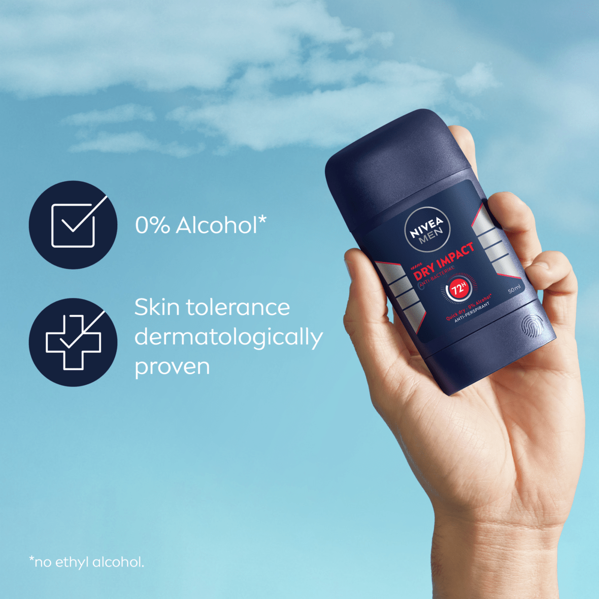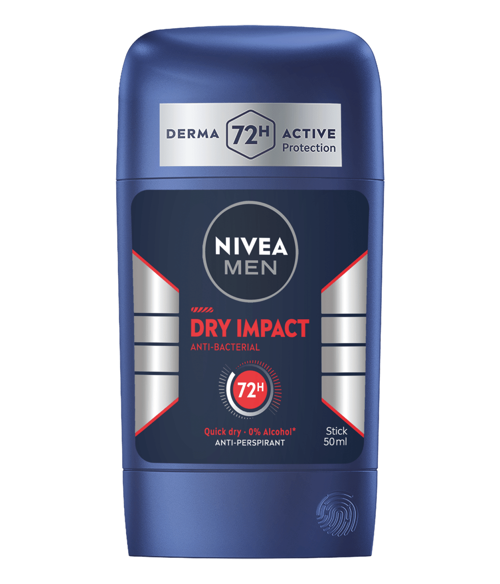 Το NIVEA MEN Dry Impact Anti-Perspirant Stick προσφέρει αξιόπιστη προστασία που φροντίζει την επιδερμίδα. Η διπλή ενεργή σύνθεση, με 2 δραστικά αντιιδρωτικά συστατικά, στεγνώνει γρήγορα στην επιδερμίδα και περιέχει 0% αλκοόλη για απαλή φροντίδα. Παρέχει αξιόπιστη αντιιδρωτική προστασία διάρκειας 72 ωρών που φροντίζει την επιδερμίδα.