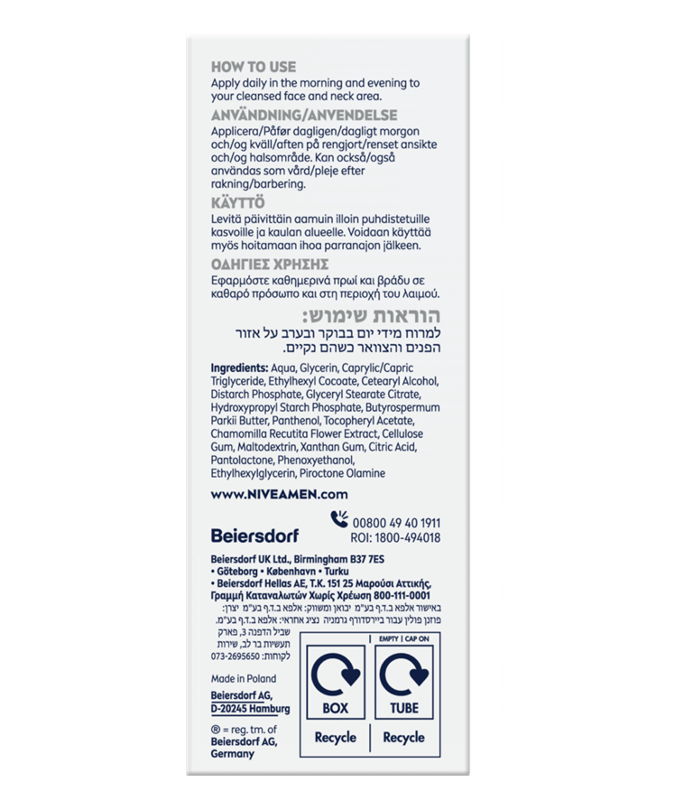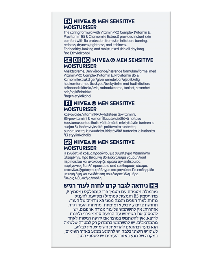 Η NIVEA MEN Sensitive Ενυδατική Κρέμα Προσώπου χωρίς άρωμα είναι μια ειδικά σχεδιασμένη ενυδατική κρέμα που έχει σχεδιαστεί για να παρέχει ενυδάτωση διαρκείας για την ευαίσθητη επιδερμίδα. Καταπραΰνει και θρέφει, εξασφαλίζοντας μια άνετη και αναζωογονημένη αίσθηση καθ' όλη τη διάρκεια της ημέρας.