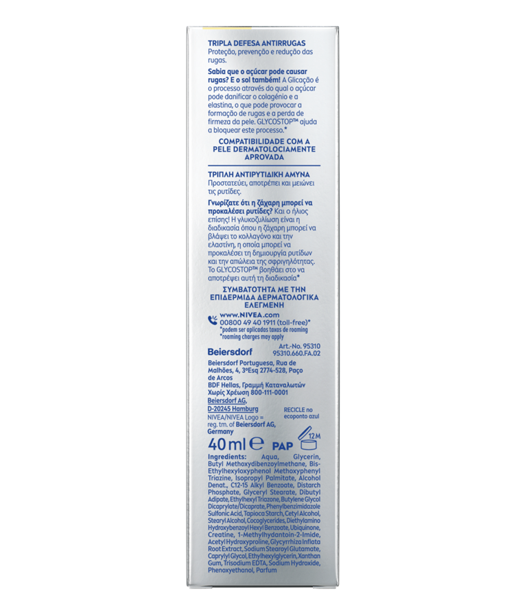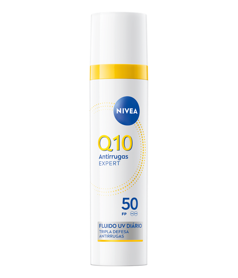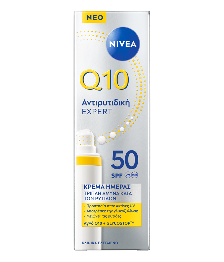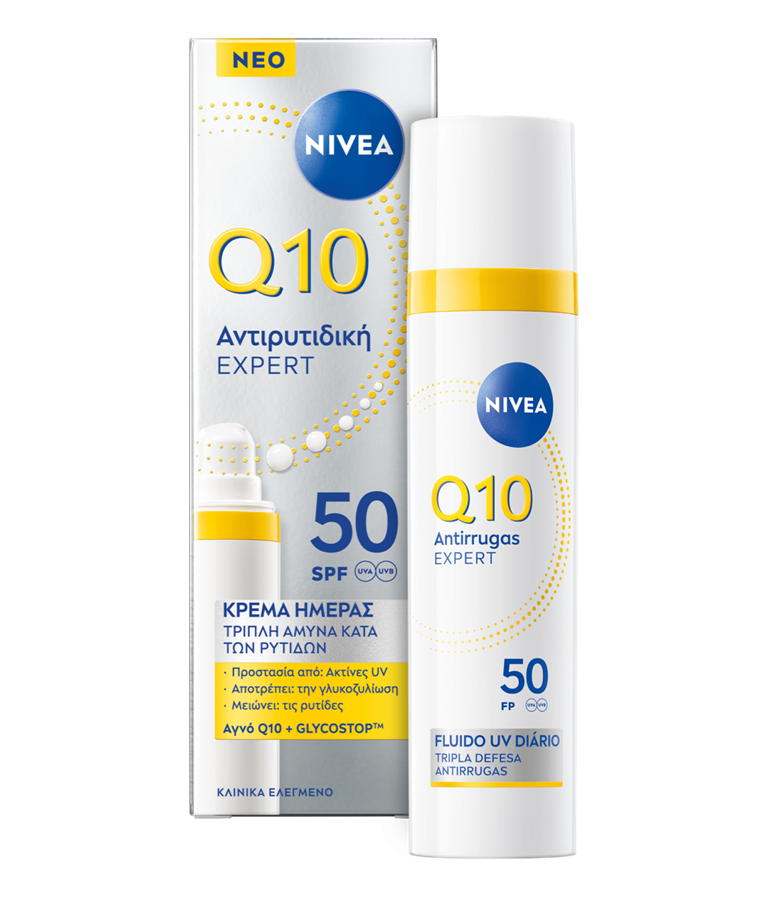 Πρόληψη, μείωση και προστασία από τις ρυτίδες που προκαλούνται από τον ήλιο και τη γλυκοζυλίωση με το νέο μας NIVEA Q10 Triple Wrinkle Defense Daily UV Fluid SPF50. Απολαύστε 12 ώρες λάμψης χωρίς γυαλάδα και τη μη κολλώδη, μη λιπαρή σύνθεσή μας.