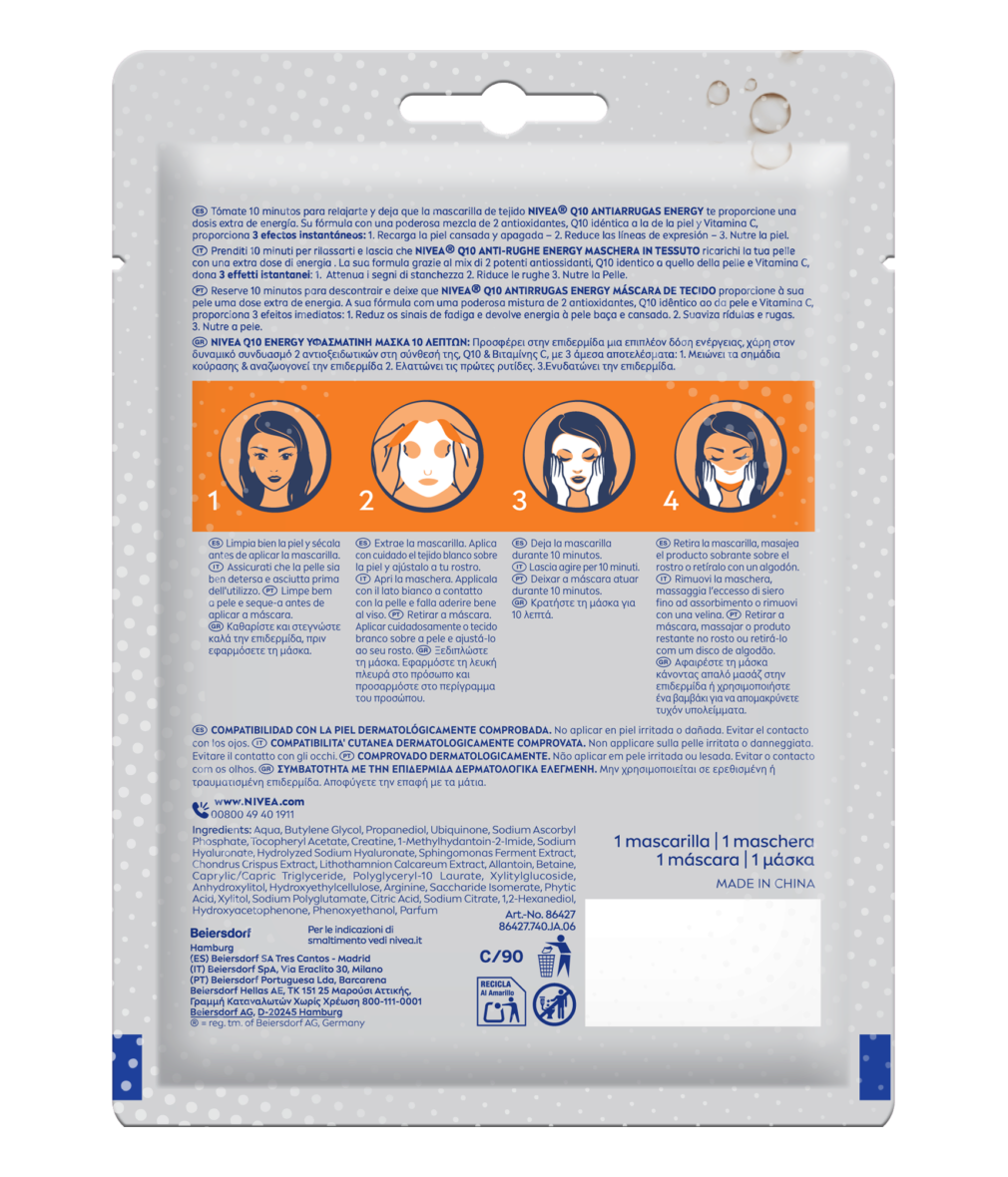 Αποκτήστε αυτήν τη φροντίδα της επιδερμίδας σας για μια τέλεια εμφάνιση. Η υφαρμάτινη μάσκα προσφέρει στην επιδερμίδα μία επιπλέον δόση ενέργειας, χάρη στον δυναμικό συνδυασμό 2 αντιοξειδωτικών στη σύνθεσή της, Q10 & Βιταμίνης C. Χρειάζονται μόνο 10 λεπτά!