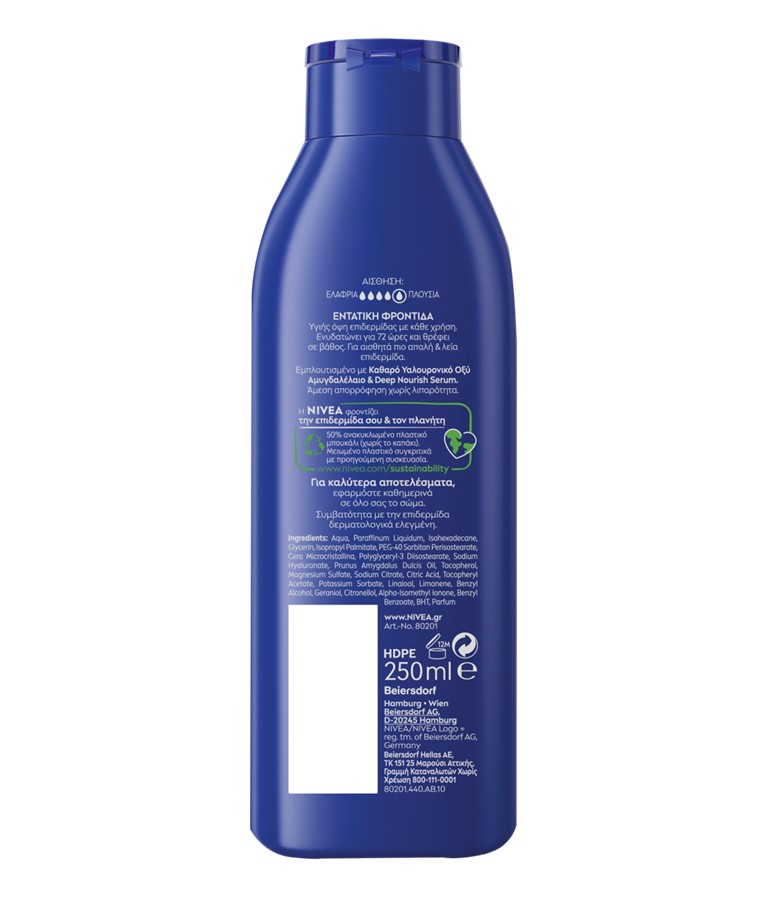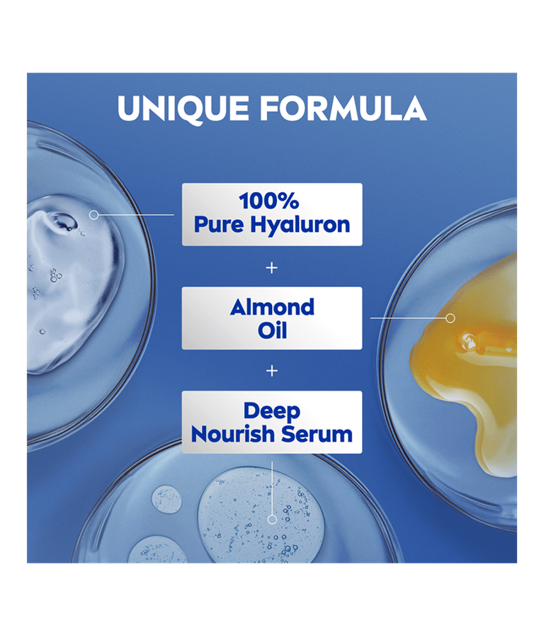 Βελτιωμένη σύνθεση, εμπλουτισμένη με Καθαρό Υαλουρονικό, Αμυγδαλέλαιο και Deep Nourish Serum. Υγιής όψη επιδερμίδας με κάθε χρήση. Ενυδατώνει για 72 ώρες και θρέφει σε βάθος. Για αισθητά πιο απαλή και λεία επιδερμίδα. Άμεση απορρόφηση χωρίς λιπαρότητα.