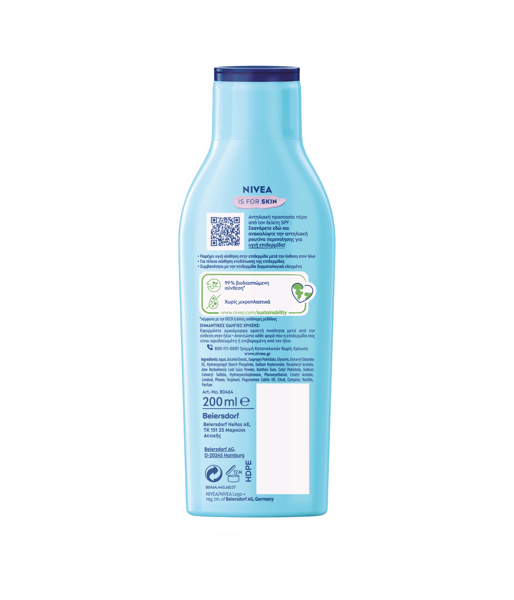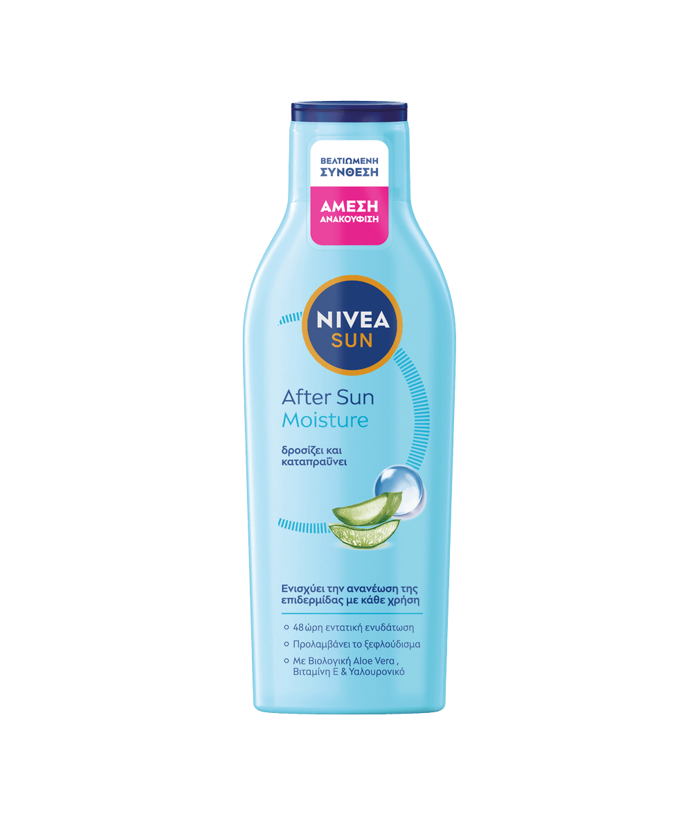 Προσφέρει άμεση ανακούφιση, καταπραΰνει και υποστηρίζει την αναγέννηση της επιδερμίδας που έχει καταπονηθεί από τον ήλιο – για ενυδάτωση εως και 48 ώρες, μείωση της απολέπισης και αναζωογονημένη αίσθηση της επιδερμίδας: NIVEA SUN After Sun Moisture Lotion