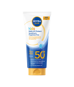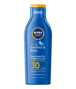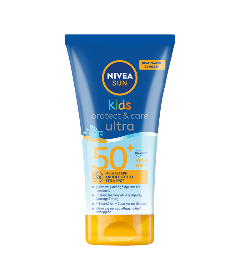 Αντηλιακή UV προστασία μακράς διαρκείας για παραλία, παιχνίδια και αθλητικές δραστηριότητες. 3x ανθεκτικότητα στο νερό από το κανονικό ανθεκτικό στο νερό αντηλιακό. NIVEA SUN Kids Ultra Protect & Care SPF50+.