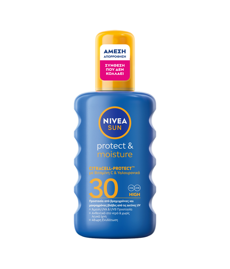 Αξιόπιστη προστασία από τις βραχυπρόθεσμες και μακροπρόθεσμες βλάβες της υπεριώδους ακτινοβολίας με τη νέα, γρήγορα απορροφητική σύνθεση CITRACELL-PROTECT™: NIVEA SUN Protect & Moisture Pump Spray