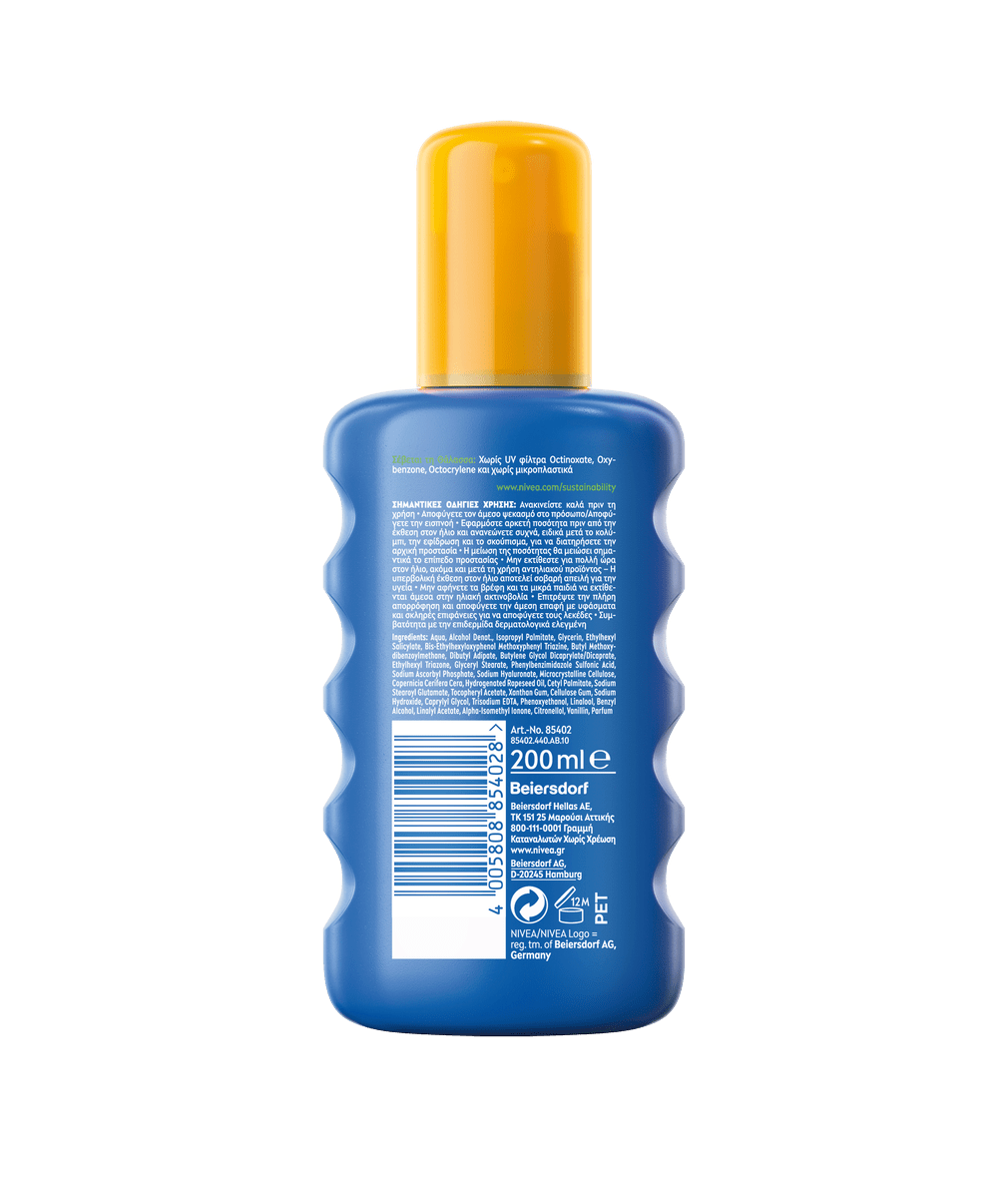 ΣΗΜΑΝΤΙΚΕΣ ΟΔΗΓΙΕΣ ΧΡΗΣΗΣ: Ανακινήστε καλά πριν τη χρήση • Αποφύγετε τον άμεσο ψεκασμό στο πρόσωπο/ Αποφύγετε την εισπνοή • Εφαρμόστε αρκετή ποσότητα πριν από την έκθεση στον ήλιο και ανανεώνετε συχνά, ειδικά μετά το κολύμπι, την εφίδρωση και το σκούπισμα, για να διατηρήσετε την αρχική προστασία • Η μείωση της ποσότητας θα μειώσει σημαντικά το επίπεδο προστασίας • Μην εκτίθεστε για πολλή ώρα στον ήλιο, ακόμα και μετά τη χρήση αντηλιακού προϊόντος – Η υπερβολική έκθεση στον ήλιο αποτελεί σοβαρή απειλή για την υγεία • Μην αφήνετε τα βρέφη και τα μικρά παιδιά να εκτίθενται άμεσα στην ηλιακή ακτινοβολία • Επιτρέψτε την πλήρη απορρόφηση και αποφύγετε την άμεση επαφή με υφάσματα και σκληρές επιφάνειες για να αποφύγετε τους λεκέδες • Συμβατότητα με την επιδερμίδα δερματολογικά ελεγμένη