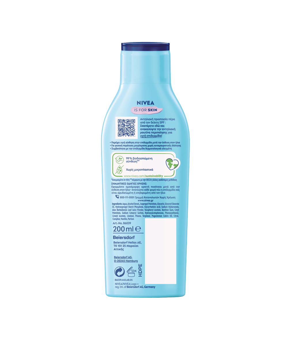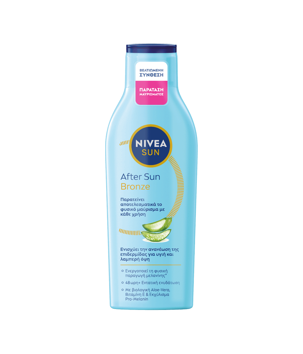 Παρατείνει το φυσικό μαύρισμα, προσφέρει υγιή λάμψη και υποστηρίζει την αναγέννηση της επιβαρυμένης από τον ήλιο επιδερμίδας – για ενυδάτωση διάρκειας 48+ ωρών, άμεση ανακούφιση και μια αναζωογονημένη αίσθηση στην επιδερμίδα: NIVEA SUN After Sun Bronze Lotion.