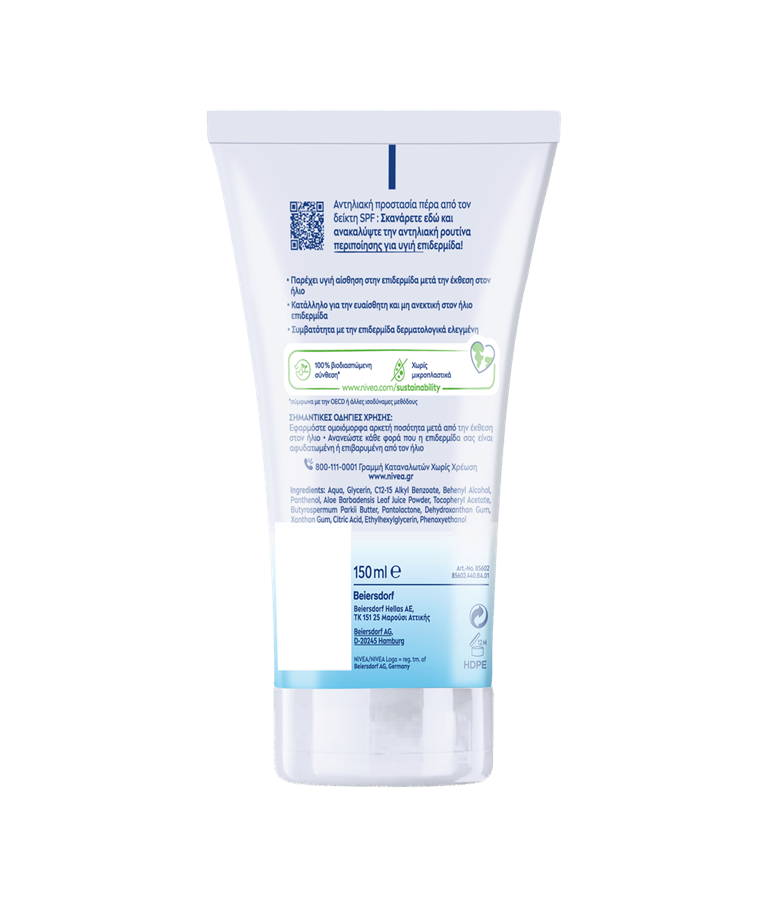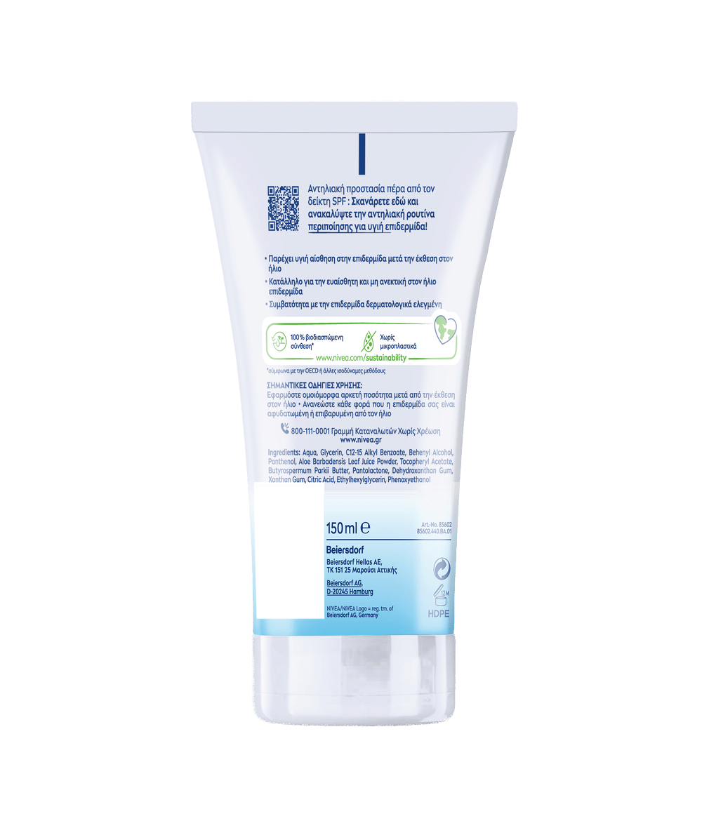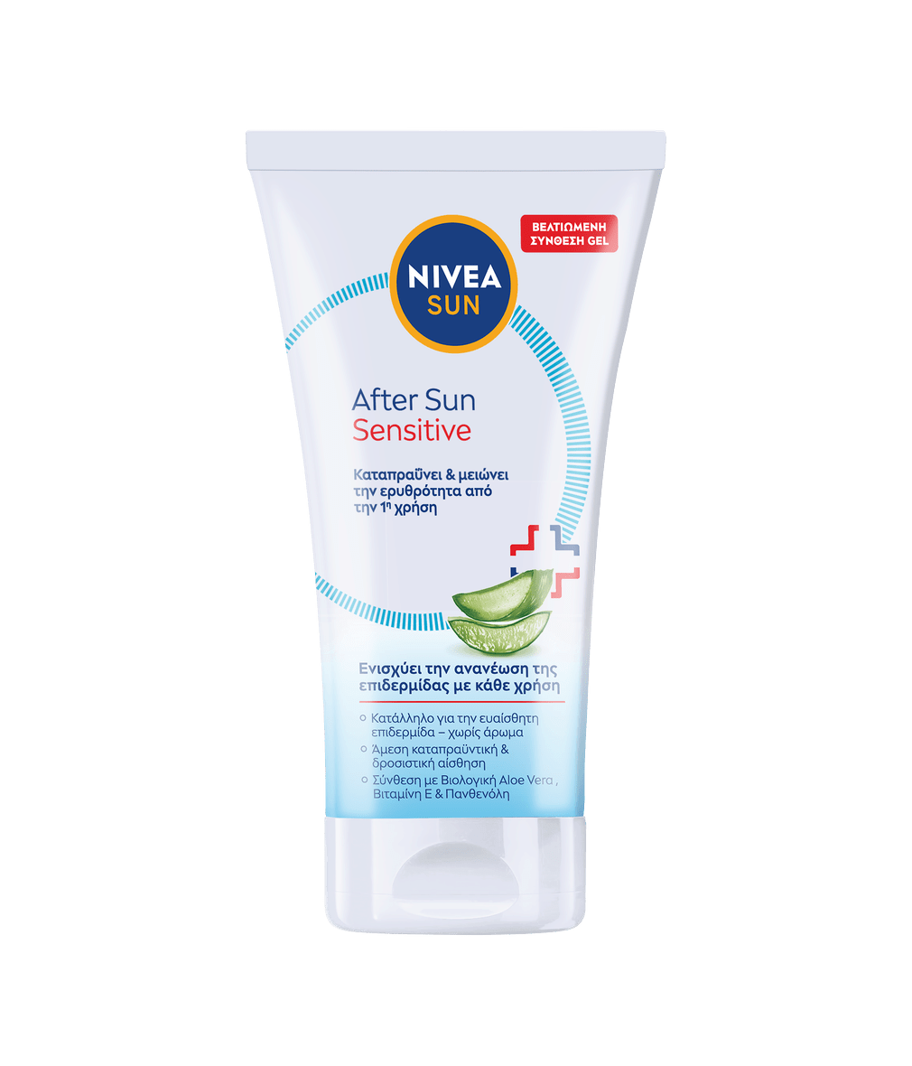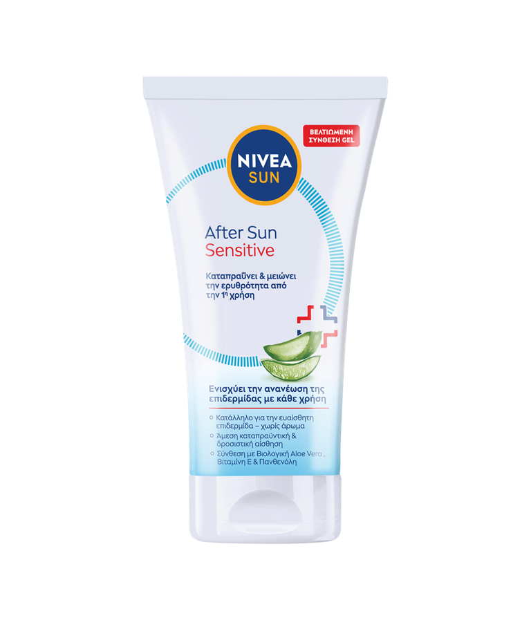 Καταπραΰνει άμεσα, μειώνει τους ερεθισμούς και υποστηρίζει την αναγέννηση της ευαίσθητης, από τον ήλιο καταπονημένης επιδερμίδας– για απαλή καταπράυνση και αίσθηση υγιούς, αναζωογονημένης επιδερμίδας: NIVEA SUN After Sun Sensitive Gel