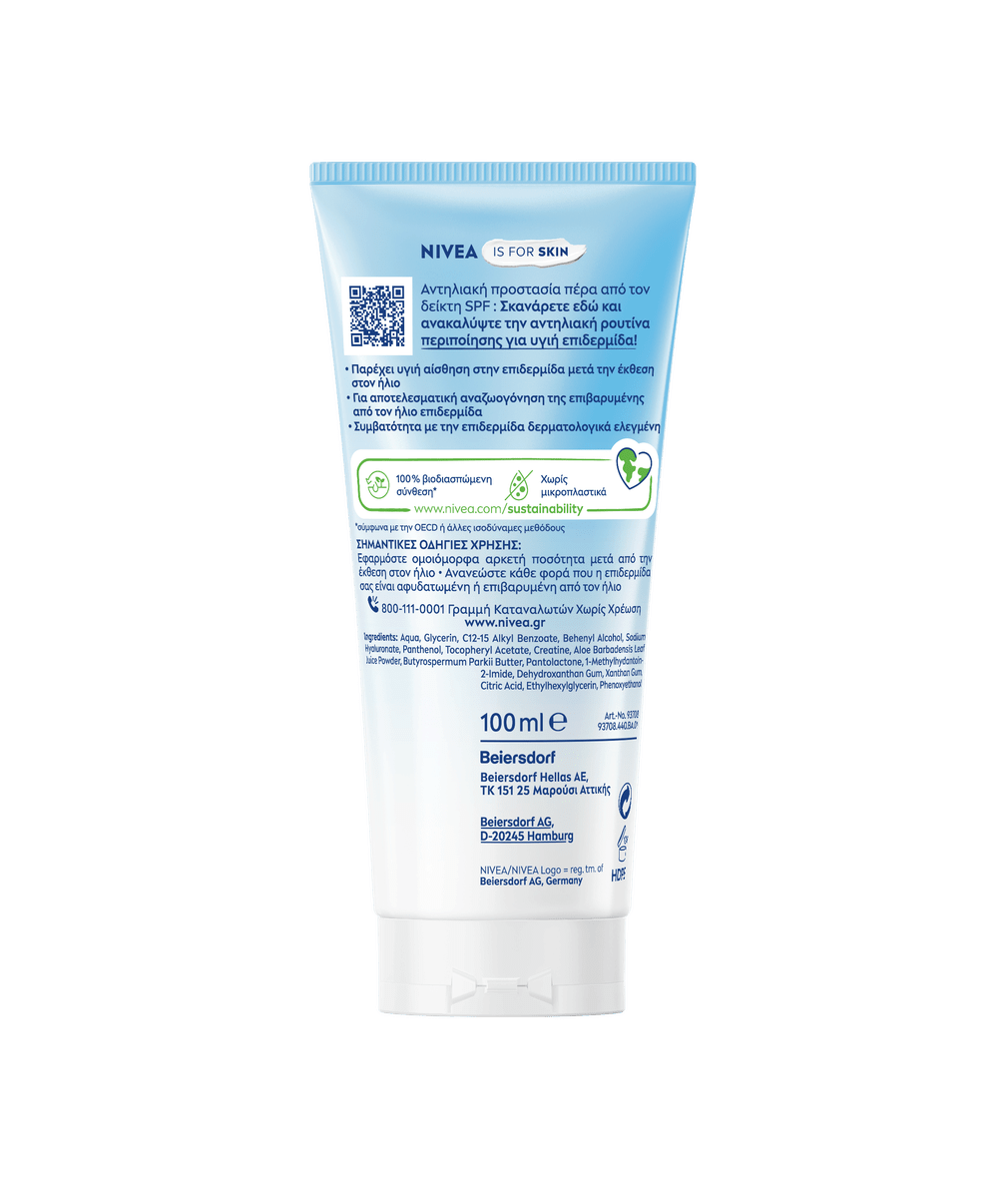 Αναπληρώνει έως και 100% της υγρασίας και υποστηρίζει τη φυσική διαδικασία αναγέννησης και επιδιόρθωσης της επιβαρυμένης από τον ήλιο επιδερμίδας – Χωρίς άρωμα, υπερ-ελαφριά σύνθεση για πρόσωπο & σώμα: NIVEA SUN After Sun Serum.