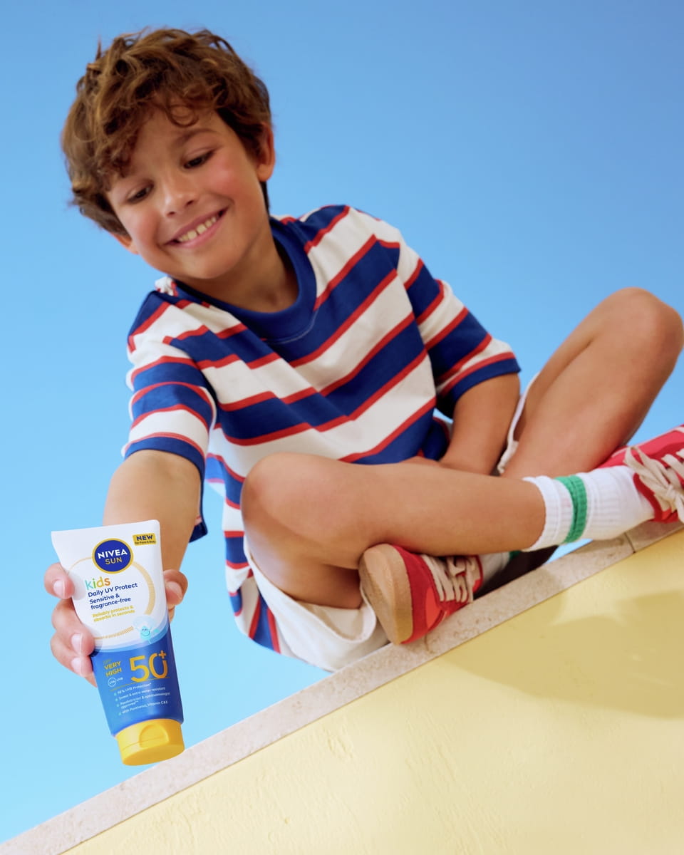 NIVEA Sun Kids Daily UV Protect SPF 50+ σχεδιασμένο για την ευαίσθητη παιδική επιδερμίδα. Χωρίς άρωμα, απορροφάται γρήγορα και είναι ανθεκτικό στον ιδρώτα και στο νερό — ιδανικό για καθημερινή χρήση σε πρόσωπο και σώμα.