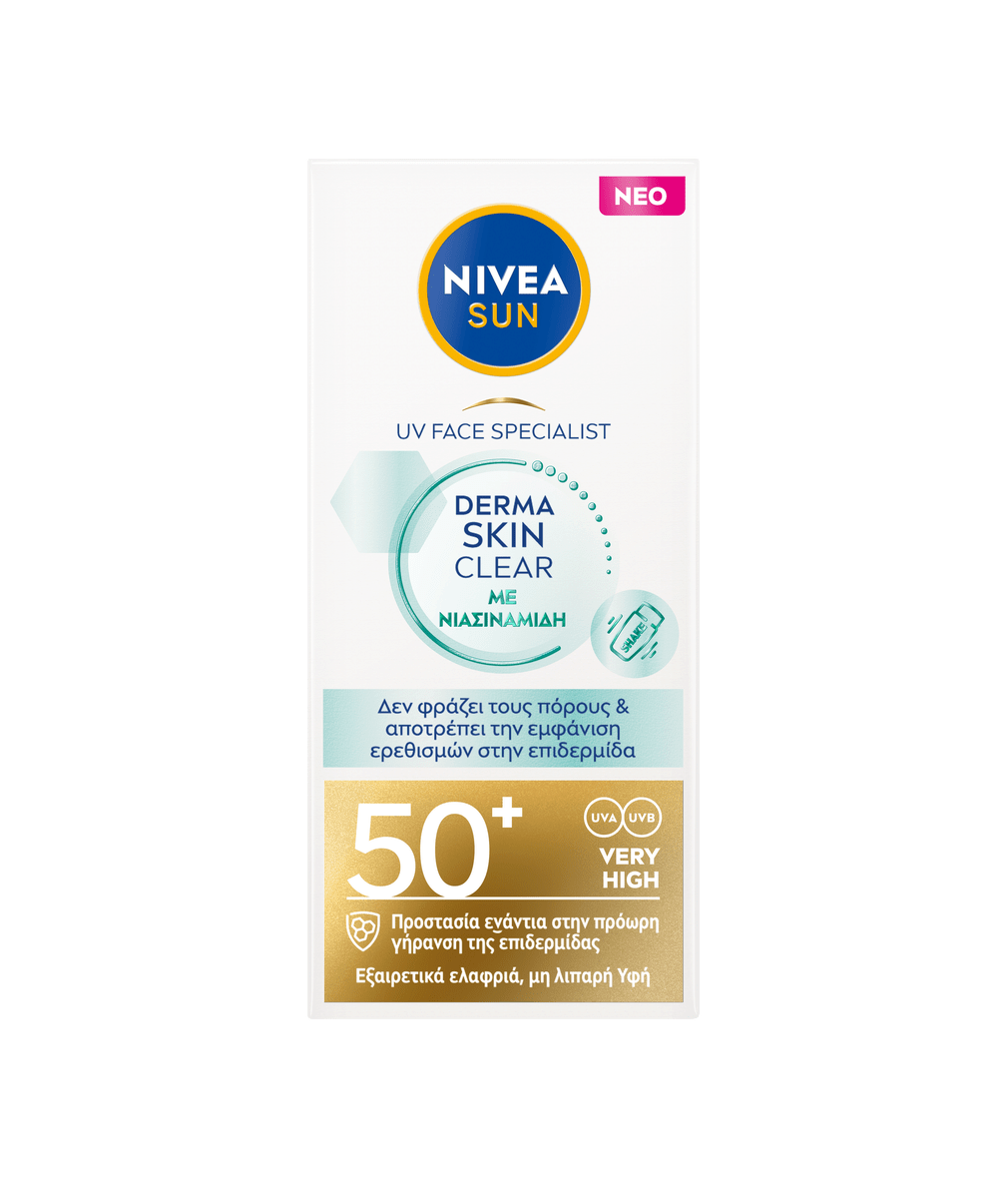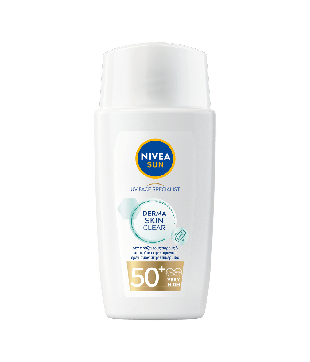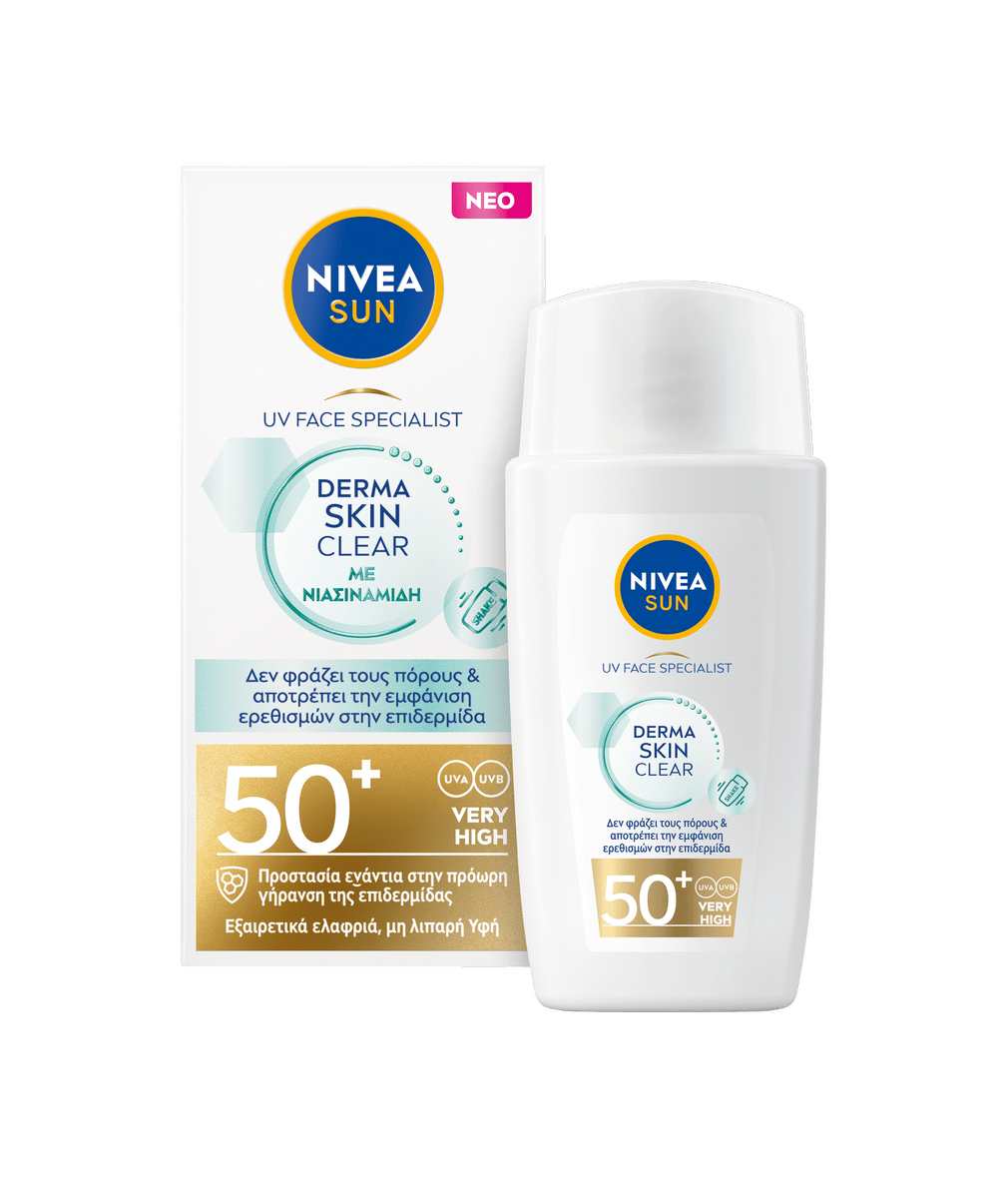 Άμεση προστασία προσώπου από τις ακτίνες UVA/UVB με σύμπλεγμα Anti-Blemish + Νιασιναμίδη που δεν φράζει τους πόρους και αποτρέπει την εμφάνιση ερεθισμών στην επιδερμίδα με 0% κολλώδη αίσθηση . Σύνθεση που σέβεται τη θάλασσα. NIVEA SUN UV Face Derma Skin Clear SPF50+