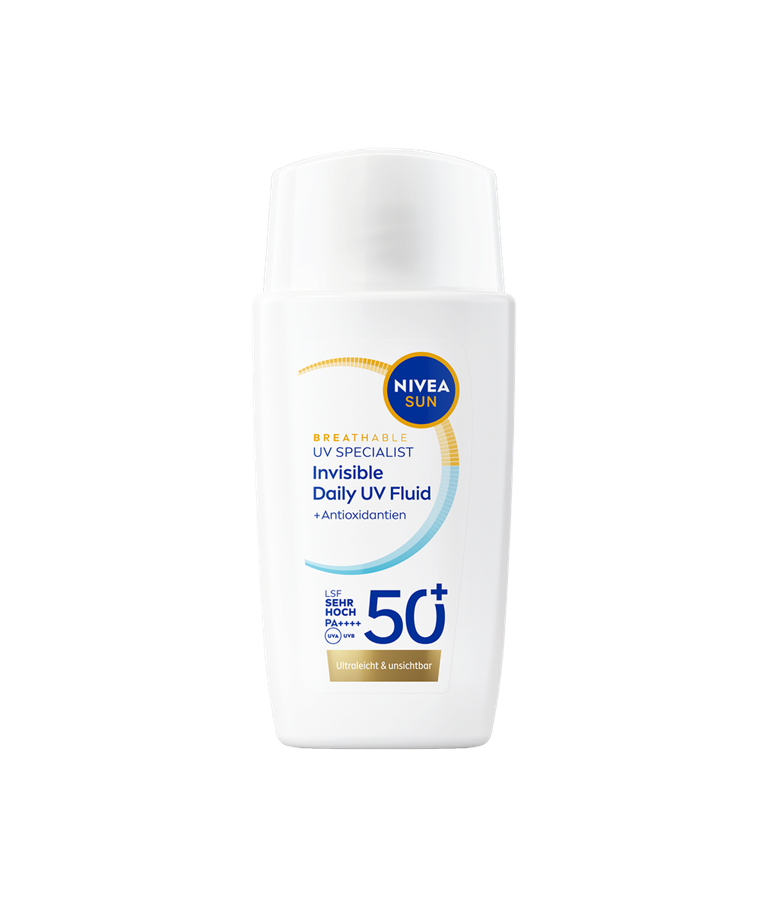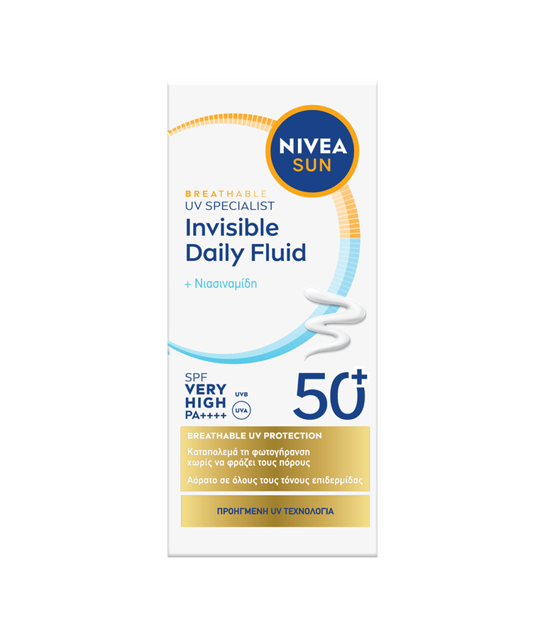 NIVEA SUN Breathable UV Specialist Invisible Daily Fluid SPF 50+ Καταπολεμά τη φωτογήρανση χωρίς να φράζει τους πόρους. Αόρατο σε όλες τις αποχρώσεις επιδερμίδας. Απορροφάται άμεσα χωρίς να αφήνει λευκά κατάλοιπα.