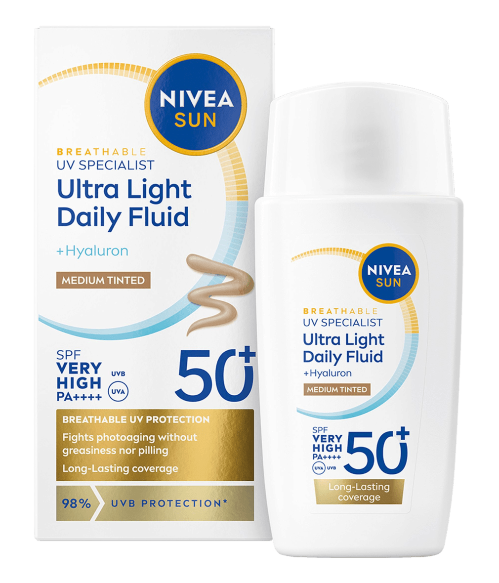 Το NIVEA SUN Breathable UV Daily Fluid Medium Tinted SPF 50+ καταπολεμά τη φωτογήρανση χωρίς να αφήνει λιπαρότητα ή να ξεφλουδίζει. Ενυδατώνει ενώ καλύπτει ατέλειες, προσφέροντας φυσική, μεγάλης διάρκειας κάλυψη.