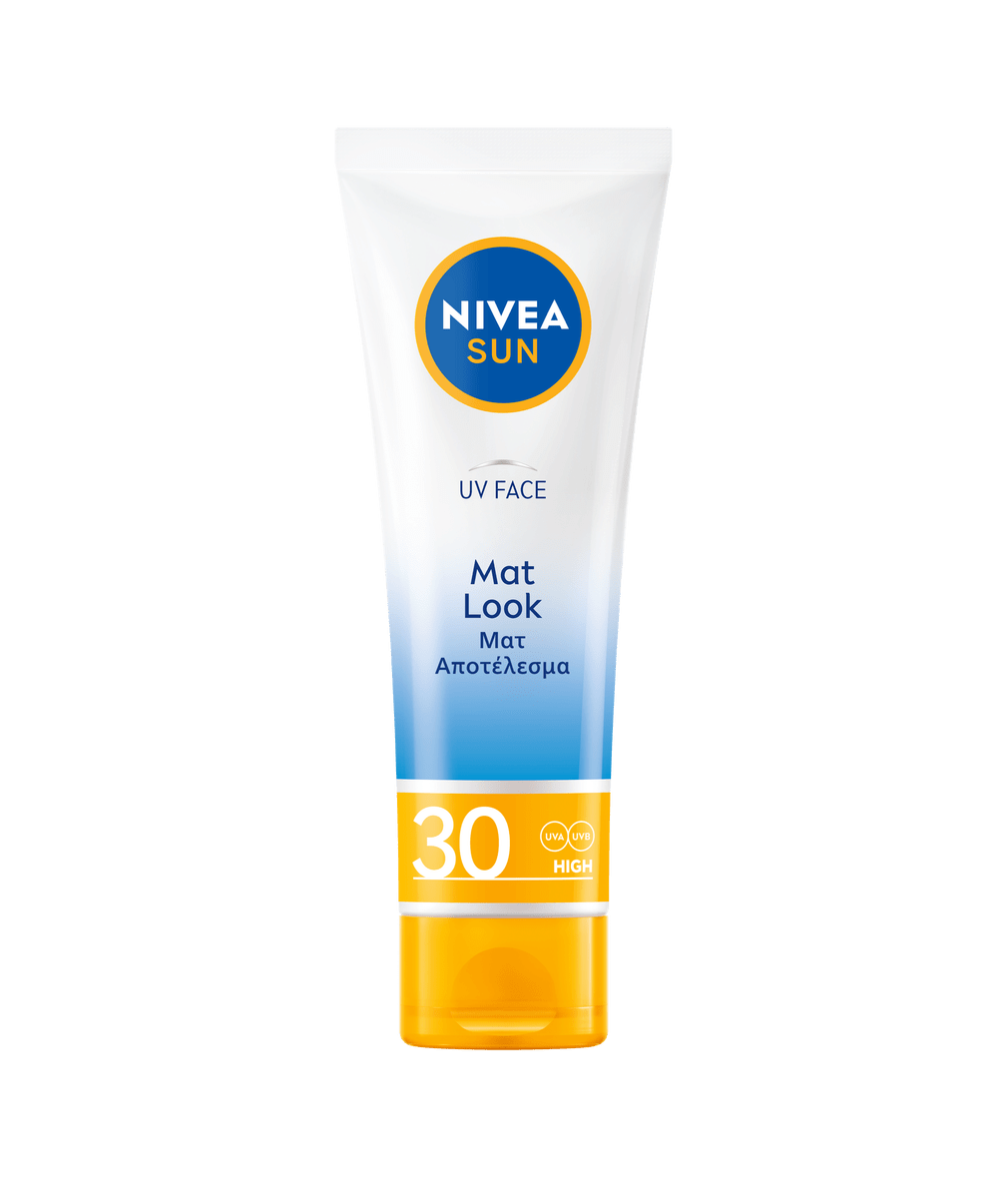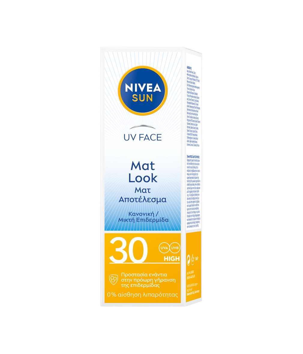 Άμεση προστασία προσώπου από τις ακτίνες UVA/UVB με ματ αποτέλεσμα & 0% κολλώδη αίσθηση. Σύνθεση που σέβεται τη θάλασσα. NIVEA SUN UV Face Mat-Look SPF 30.