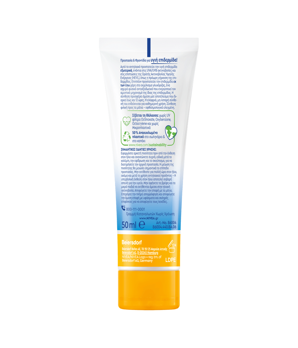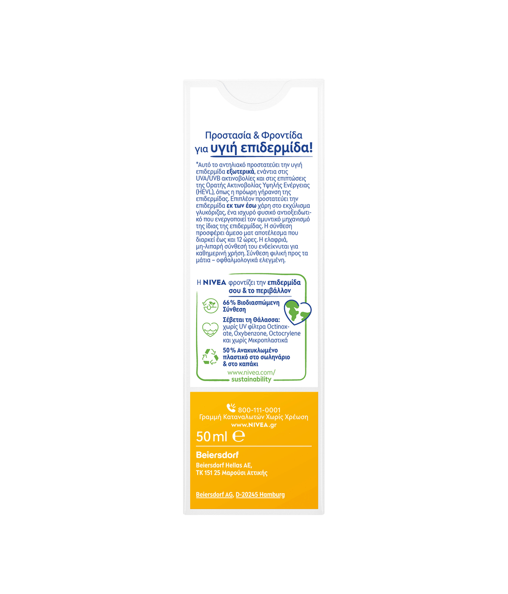 - Βιωσιμότητα – Σύνθεση 73% βιοδιασπώμενη που σέβεται τη θάλασσα, χωρίς UV Φίλτρα Octinoxate, Oxybenzone & Octocrylene και χωρίς μικροπλαστικά. Το σωληνάριο και το καπάκι είναι από 50% ανακυκλωμένο πλαστικό. Κουτί από FSC εγκεκριμένο χαρτόνι.