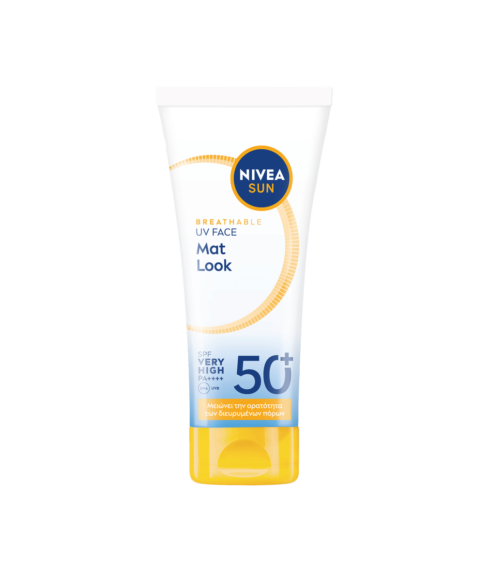 NIVEA SUN UV Face Mat – Look SPF 50+ . Προστατεύει από τη φωτογήρανση χωρίς να φράζει τους πόρους, ελέγχει τη λιπαρότητα έως και 12 ώρες & μειώνει την ορατότητα των πόρων στην επιδερμίδα.