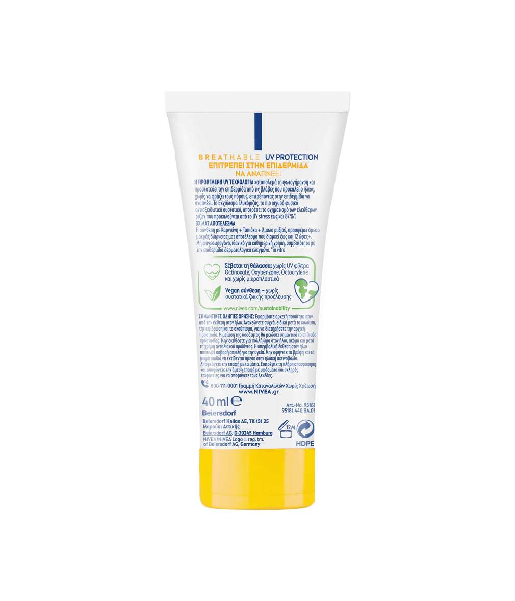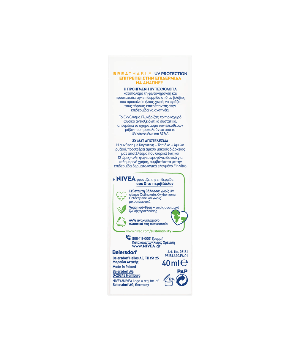 - Η NIVEA ΦΡΟΝΤΙΖΕΙ ΤΗΝ ΕΠΙΔΕΡΜΙΔΑ & ΤΟΝ ΠΛΑΝΗΤΗ – Vegan σύνθεση, χωρίς Octinoxate, Oxybenzone, Octocrylene και μικροπλαστικά.