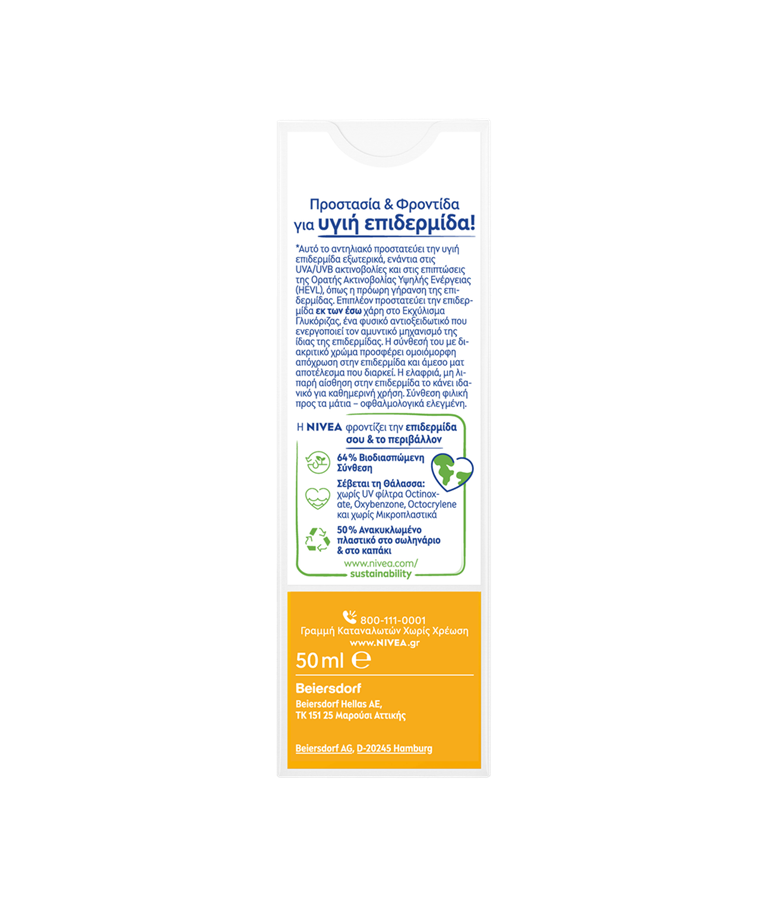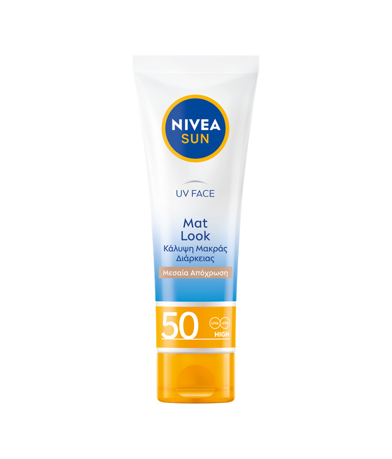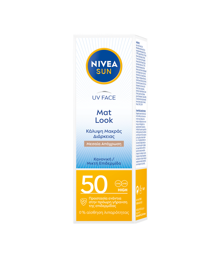 Άμεση προστασία προσώπου από τις ακτίνες UVA/UVB με χρώμα που προσφέρει ομοιόμορφη απόχρωση στην επιδερμίδα, ματ αποτέλεσμα & 0% κολλώδη αίσθηση. Σύνθεση που σέβεται τη θάλασσα. NIVEA SUN UV Face Mat-Look Tinted Cream SPF 50.