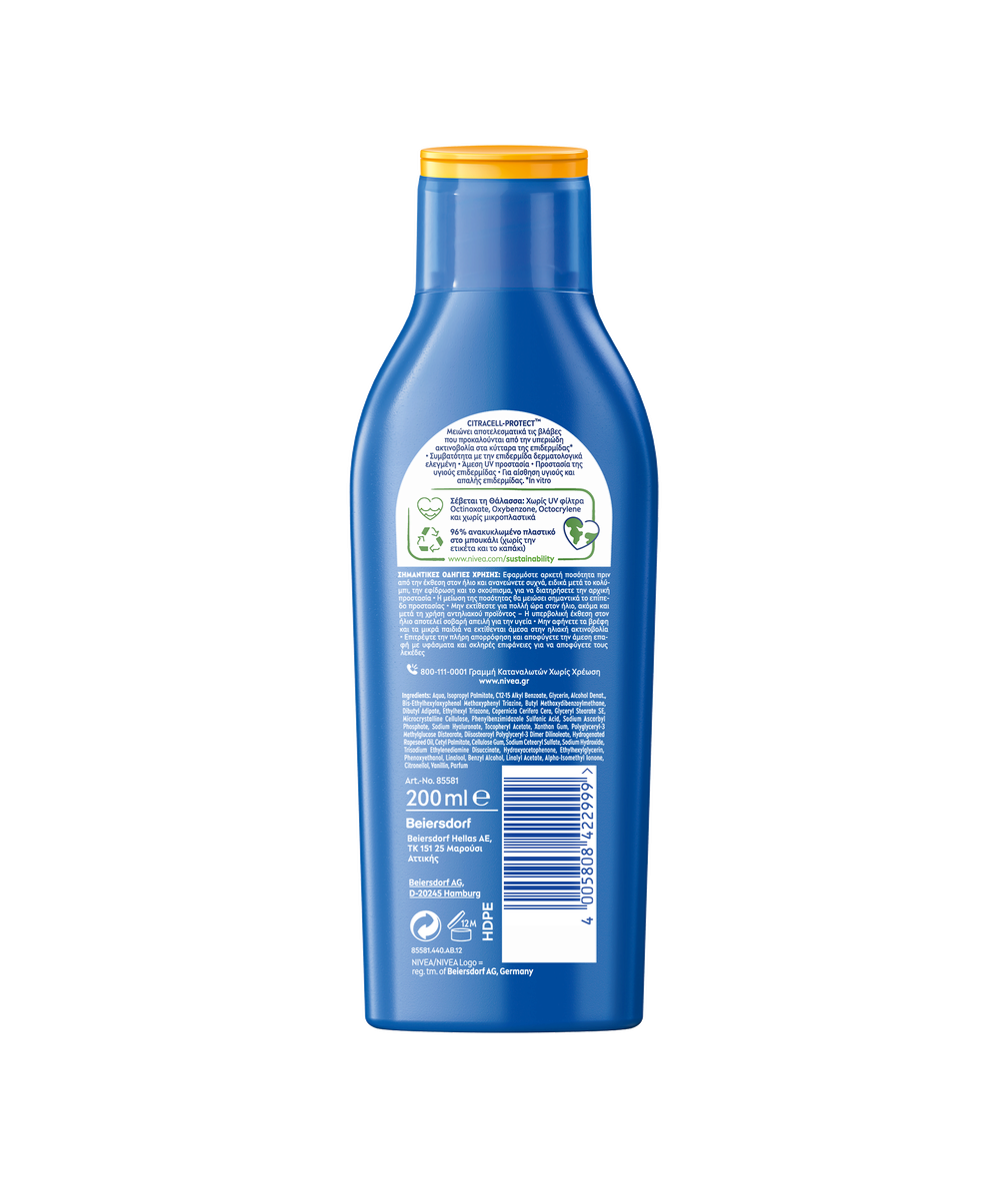Αξιόπιστη προστασία από τις βραχυπρόθεσμες και μακροπρόθεσμες βλάβες της υπεριώδους ακτινοβολίας με τη νέα, γρήγορα απορροφητική σύνθεση CITRACELL-PROTECT™: NIVEA SUN Protect & Moisture Lotion