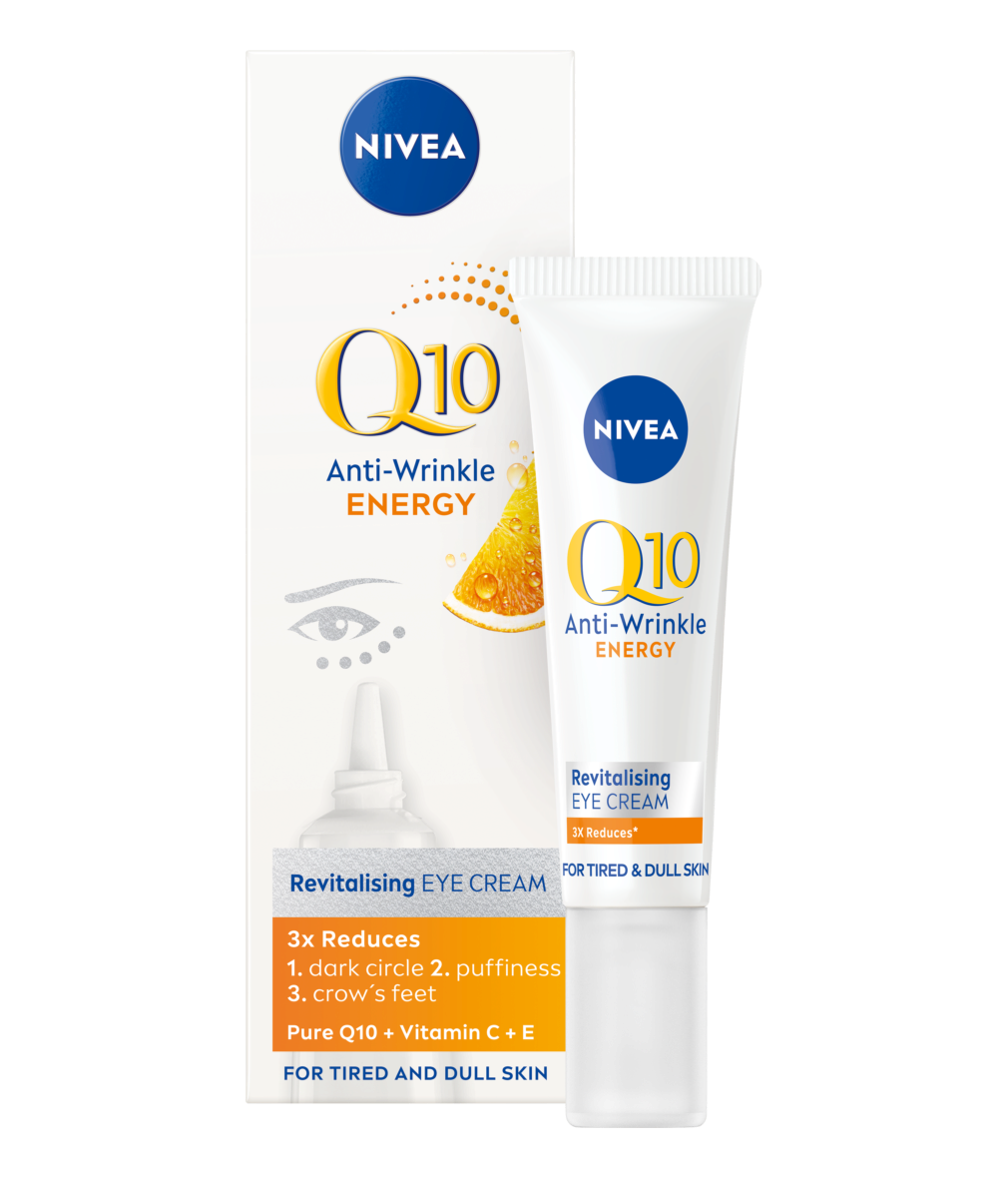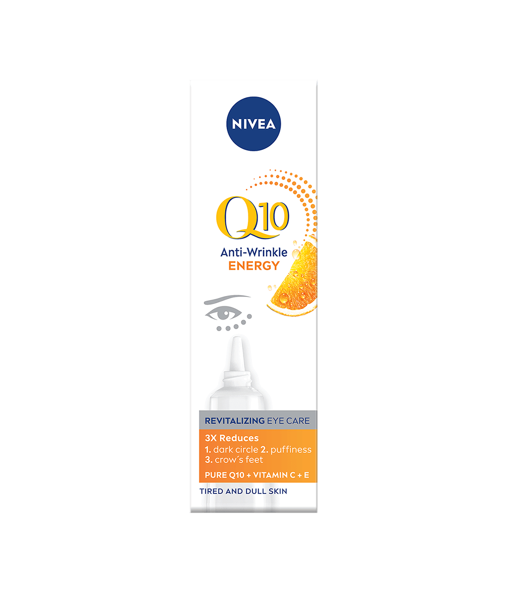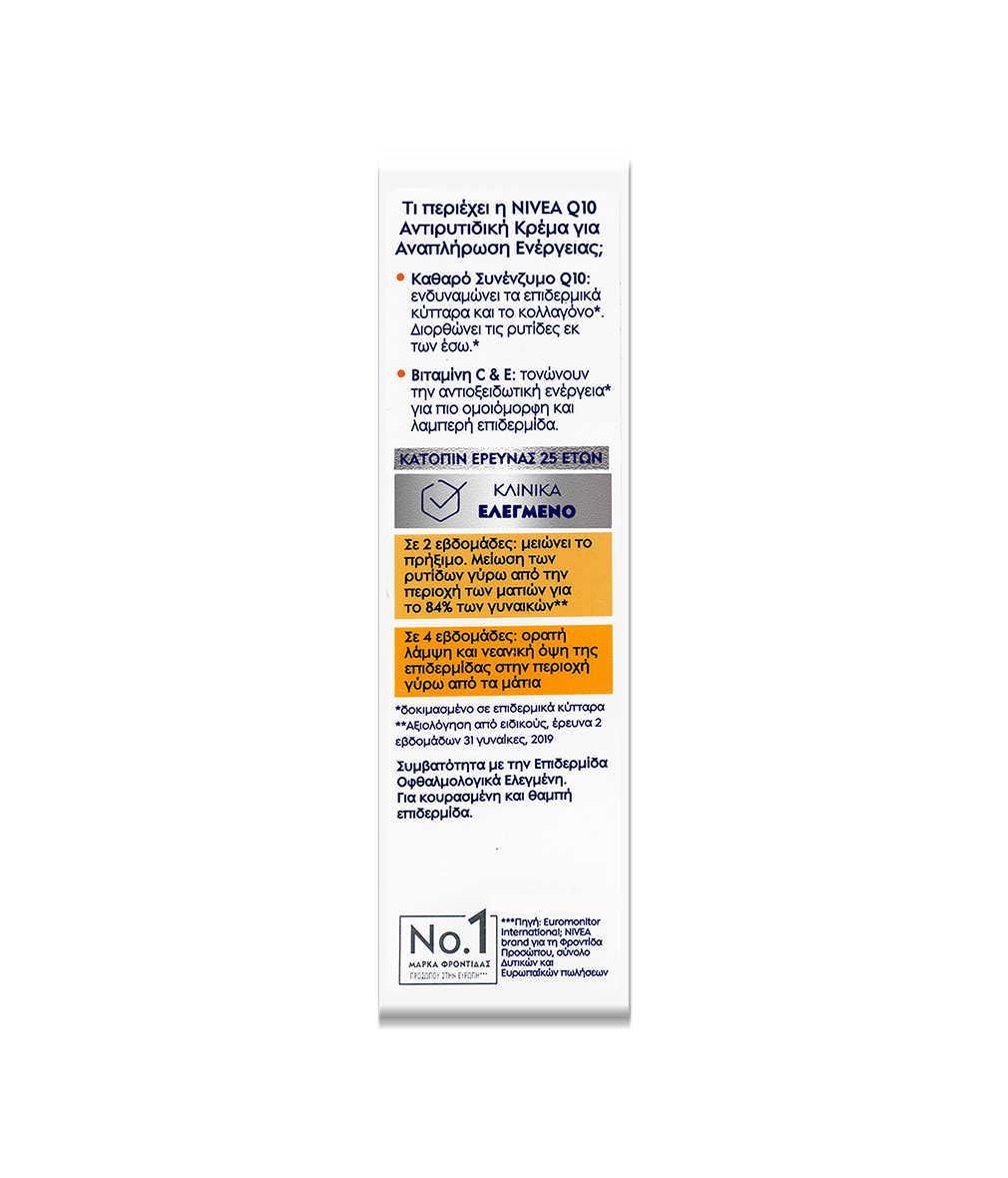 Nivea ® Q10 ENERGY Αντιρυτιδική Θεραπεία Ματιών για Αναπλήρωση Ενέργειας Ελαφριά υφή, ειδικά σχεδιασμένη για την ευαίσθητη περιοχή των ματιών Καθαρό Συνένζυμο Q10: απορροφάται από κάθε κύτταρο της επιδερμίδας Βιταμίνες C&E: για πιο ομοιόμορφη και λαμπερή επιδερμίδα